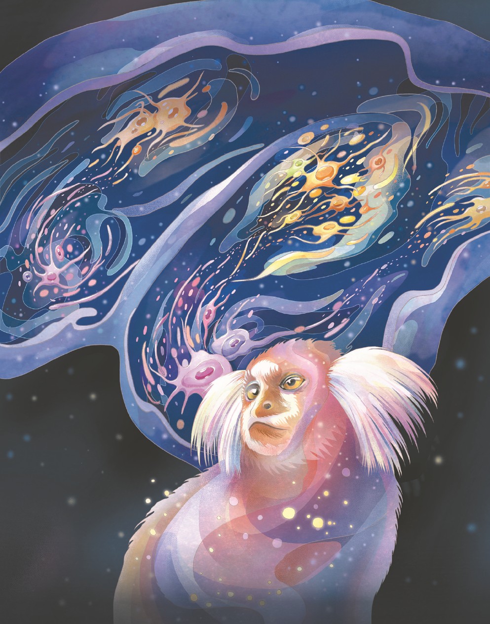 尽管狨猴的解剖结构与人类相去甚远,但在负责处理社会性发声(人类语言的前身)的听觉皮层,却与人类表现出惊人的“趋同进化”分子特征。这为探索人类语言起源提供了宝贵的分子线索。