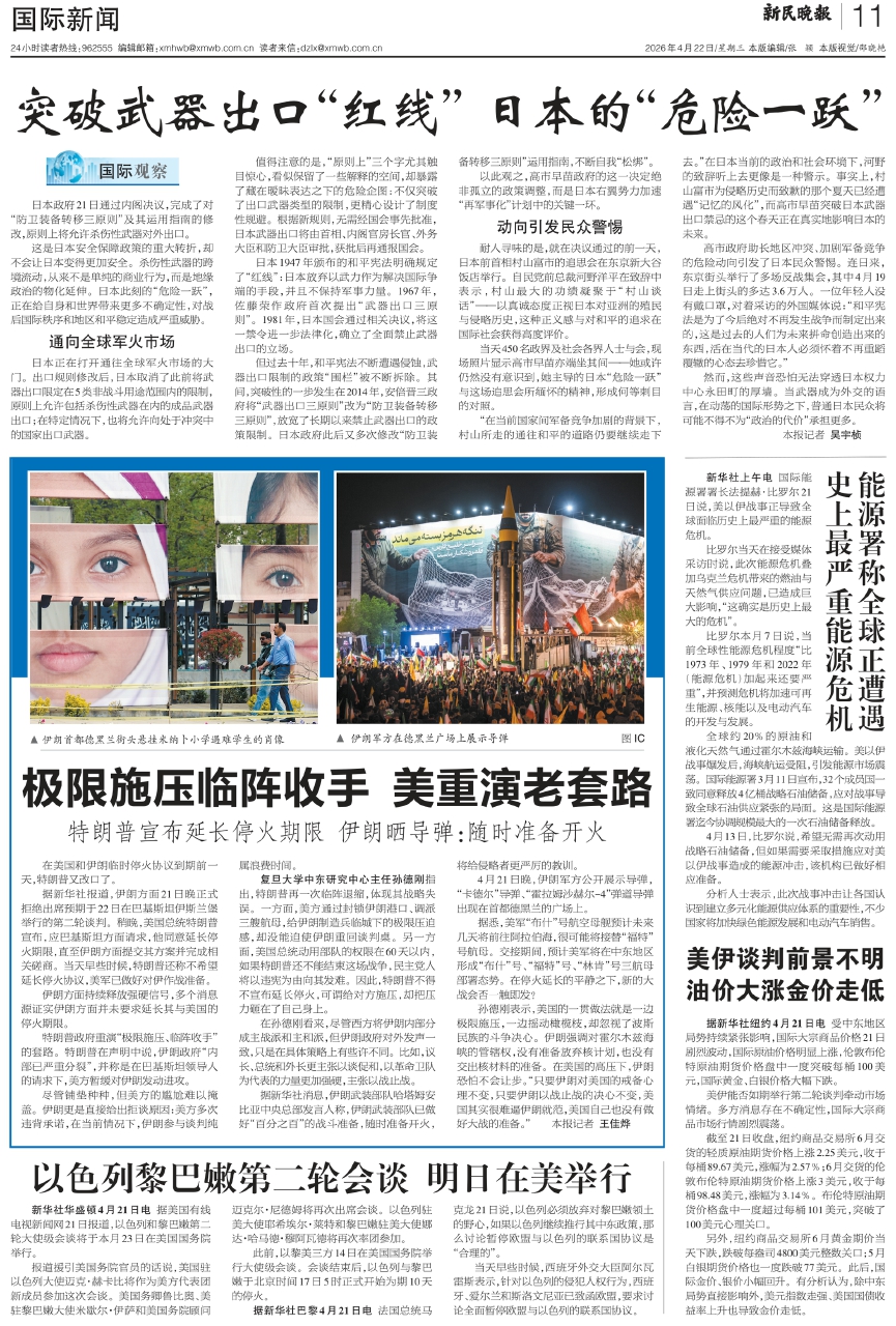 据新华社报道,伊朗方面21日晚正式拒绝出席预期于22日在巴基斯坦伊斯兰堡举行的第二轮谈判。稍晚,美国总统特朗普宣布,应巴基斯坦方面请求,他同意延长停火期限,直至伊朗方面提交其方案并完成相关磋商。当天早些时候,特朗普还称不希望延长停火协议,美军已做好对伊作战准备。