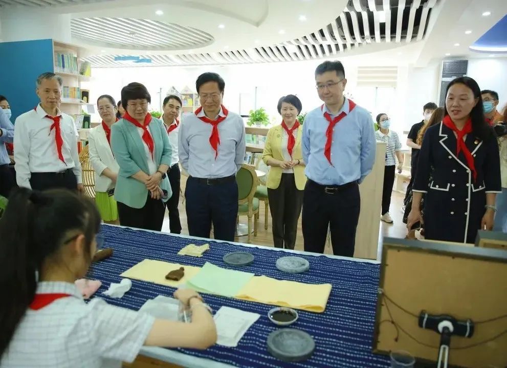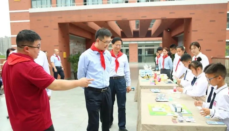 在上海师范大学附属第五嘉定实验学校和嘉定区嘉一实验初级中学,学生们为周文杰一行戴上了鲜艳的红领巾,在参观心理画展示时,周文杰细心询问学生创作作品时的心理状态、想法。走访中,周文杰叮嘱上师五实验一定要依靠专业力量,办一所更加现代化、更加专业的学校。随后举行的“六一”主题集会上,以孩子们为主角表演的《师说》片段,台词掷地有声、抑扬顿挫,传递了嘉定少年儿童的精气神。