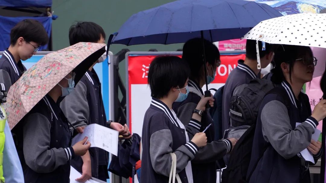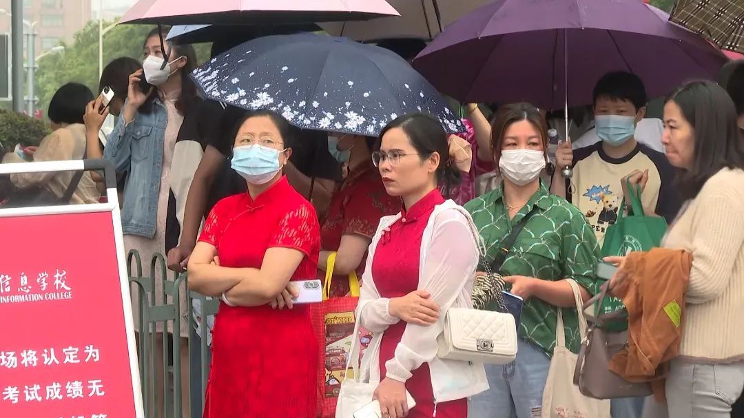 陪考家长们也叮嘱着孩子要放平心态,他们的拥抱、等待和加油鼓劲,也是考生们披荆斩棘的力量。记者观察到,今天家长们也做足了准备,背了大包小包以备不时之需,也换上了“红衣战袍”,“金榜题名”的T恤和寓意着“旗开得胜”“步步高”的旗袍处处可见,满满都是对孩子们的期盼。