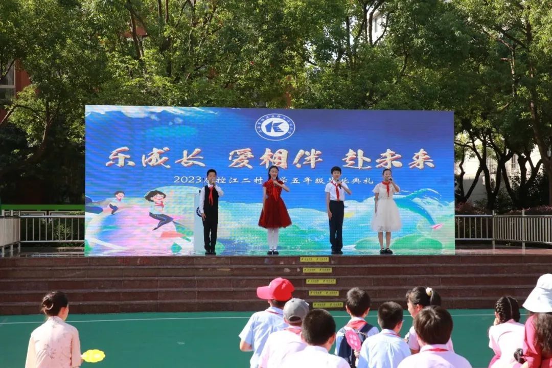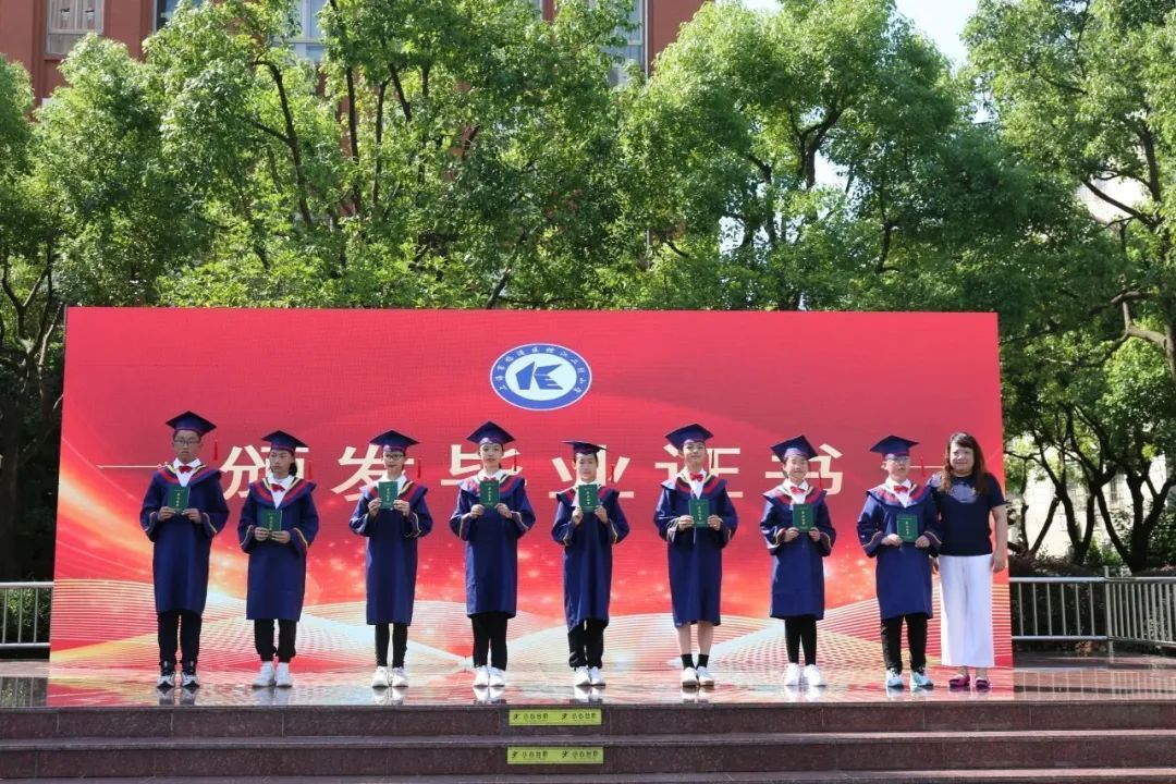 毕业典礼上,楼蓓芳校长为所有毕业生送上温情的寄语,她勉励毕业生们要怀揣梦想,知行合一方能奋进人生。远行在即,号角长鸣,成长是一首快乐的歌。在五年的校园生活中,同学们努力用学习与收获谱写一个个跃动的音符。这首歌里有课堂上的朗朗诵读,有活动里的奇思妙想,有操场上的肆意奔跑,还有社团里的灵感创造……毕业典礼上,孩子们共同奏响快乐音符,为成长点赞。