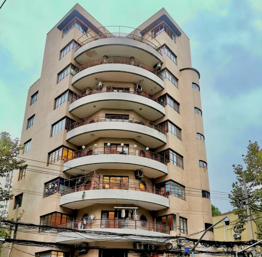 麦琪公寓位于复兴西路24号,于1936年建成。这幢10层的公寓建筑,坐北朝南,主体结构呈扇形。建筑立面中心为转角处的弧形敞开式阳台,阳台与两旁的转角窗相接;顶层局部退台。南立面东侧有半圆形外凸柱体,既与转角阳台相呼应,又丰富了主立面的层次感。