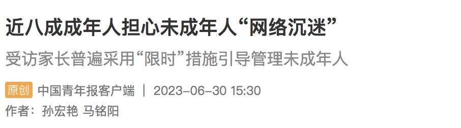 今年6月,《未成年人网络权益保护及安全感满意度调查报告》显示,近八成成年人担心未成年人“网络沉迷”。在“个人隐私泄露”“网络欺凌”