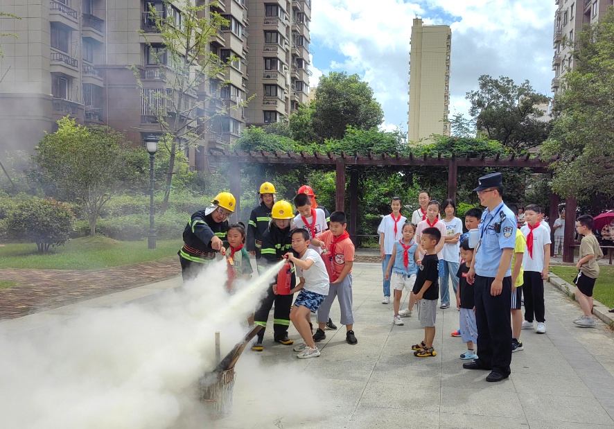 除了加强与学校、家庭的密切联动,宝山警方还注重发挥社区平安共治优势,让暑期最后一课“动起来”。开学前夕,罗南派出所民警李志钢走进美罗家园,携手社区消防志愿者带领20余名社区“暑托班”的学生进行了一次消防演习,让他们依次实践操作了灭火器,将消防安全知识从课本融入实践。民警还把体验汽车行驶视线盲区、提防网络游戏诈骗陷阱等以小实验、小剪报的形式融入暑期安全教育,并在开学前“收”作业、讲安全,让学生们在假期“最后一刻”体验到新学期安全第一课。