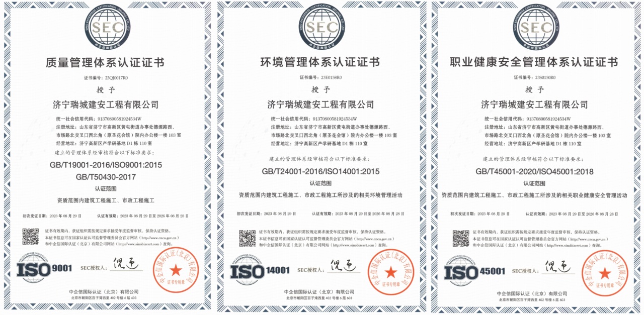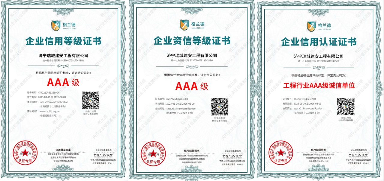 立足新起点,阔步新征程。济宁瑞城建安工程公司将以顺利通过“三标一体”管理体系及“AAA级信用企业”认证为新起点,秉承科学的经营理念,持续推进管理体系优化,进一步推动企业信用体系建设,不断提高企业运行效能;以业务发展为中心,以工程项目管理为着力点,以合同履约为工作抓手,努力打造行业领先的全要素、全链条、全周期的项目管控体系;对于新开项目,结合企业发展及管理实际,优组织、立规章、明责任,多管齐下赋能业务发展,走上结构更优、效率更高、效益更好的可持续的高质量发展之路。(大众日报客户端记者 孟一 报道)