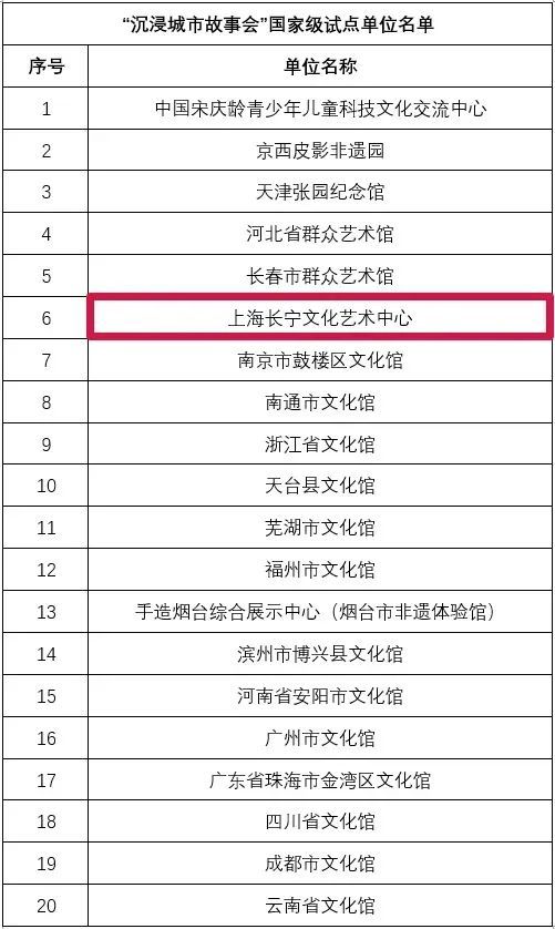 项目自今年7月启动征集工作,经单位自主申报、省级初审公示、专家评审等环节,最终,包括上海长宁文化艺术中心在内的全国20家单位脱颖而出,成为首批“沉浸城市故事会”国家级试点。