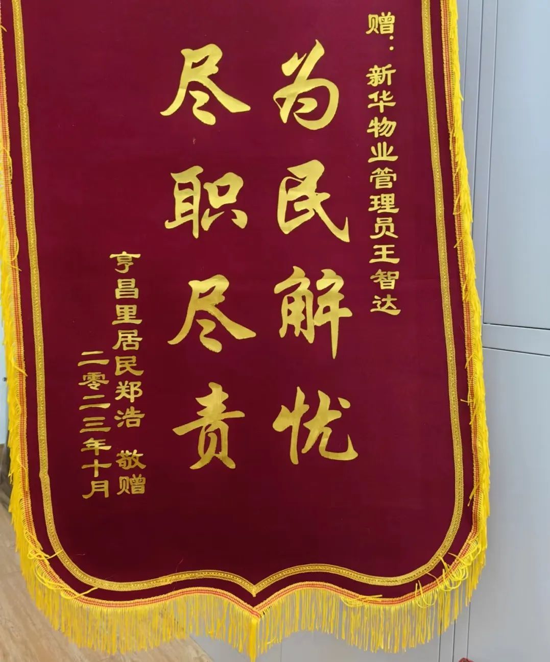 近日,新长宁集团新华物业收到亨昌里居民送来的内容为“为民解忧、尽职尽责”的表扬锦旗,表扬小区管理员王智达尽心尽力上门调解邻里纠纷矛盾,为民解忧,认真负责的工作态度。