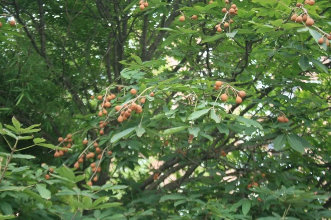 每年9月底~11月,七叶树的果实迎来了成熟的季节,稀疏刺的绿色外壳微微裂开,内部长得像栗子一样的种子若隐若现。