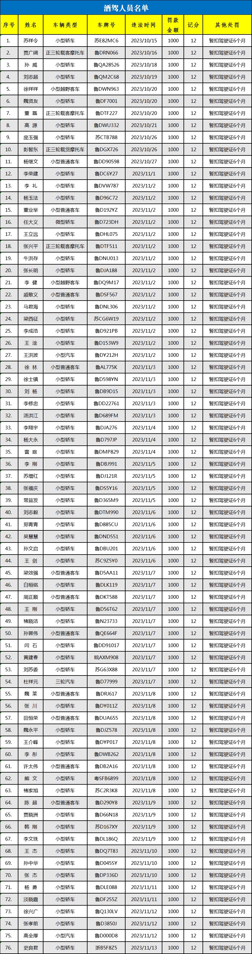 枣庄市公安局交警支队向社会曝光“酒驾”严重违法驾驶人76名。根据《中华人民共和国道路交通安全法》第九十一条、九十二条、第一百零一条等相关规定,由公安机关对这76名酒驾驾驶人作出了驾驶证记12分、罚款1000元、暂扣驾驶证6个月的处罚。
