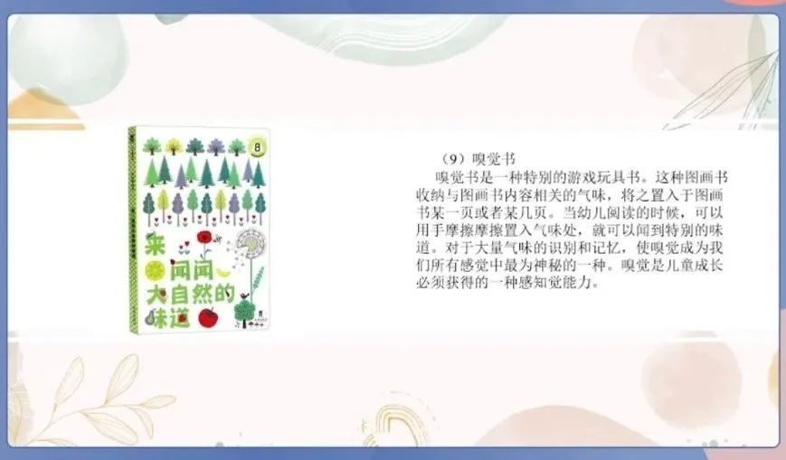 例如,嗅觉书是一种特别的游戏玩具书。这种图画书收纳了与书中内容相关的气味,不同的书页有不同的味道。当幼儿阅读的时候,用手摩擦书页,就可以闻到特别的味道。对于大量气味的识别和记忆,使嗅觉成为我们所有感觉中最为神秘的一种,嗅觉也是儿童成长必须获得的一种感知能力。