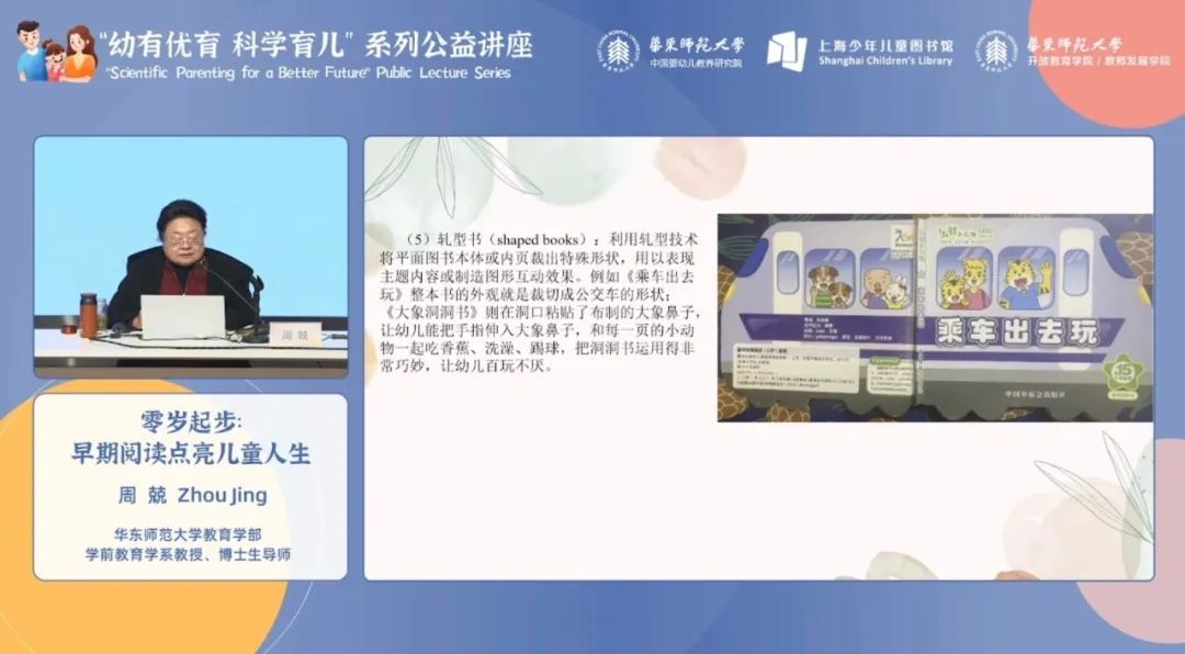 近日,华东师范大学中国婴幼儿教养研究院成立仪式暨“幼有优育 科学育儿”系列公益讲座举行。华东师范大学教授、ESEC儿童语言研究中心主任、世界学前教育组织中国委员会执行主席周兢带来了讲座《零岁起步:早期阅读点亮儿童人生》,向家长们介绍各种有趣好玩的图画书,提出一些帮助家长和孩子共读的有效建议。