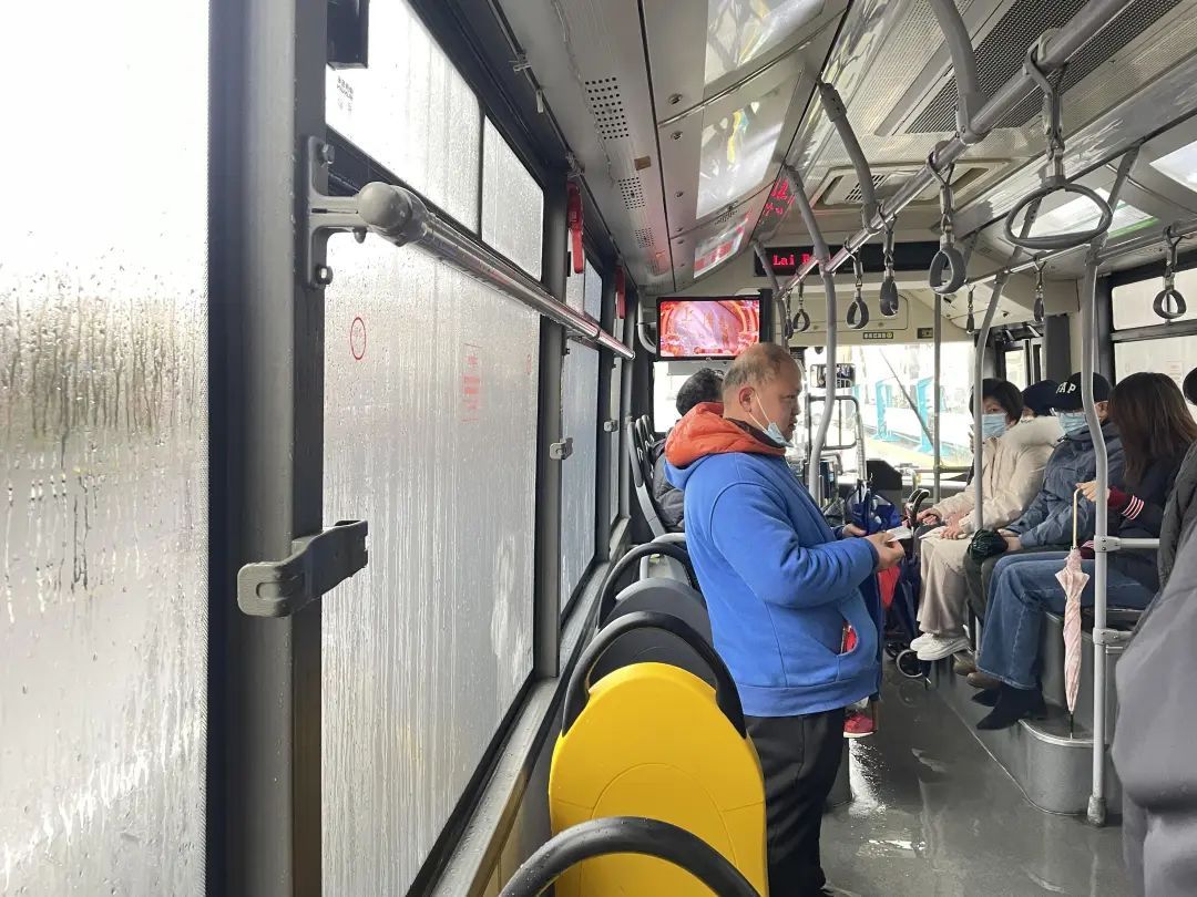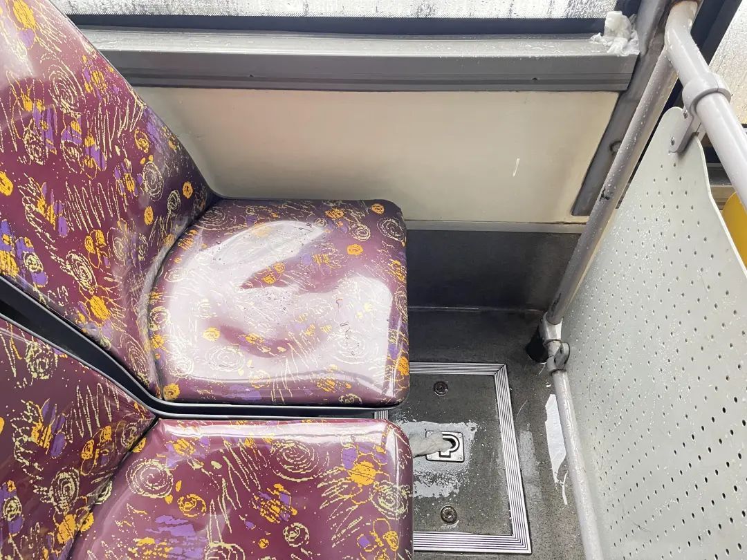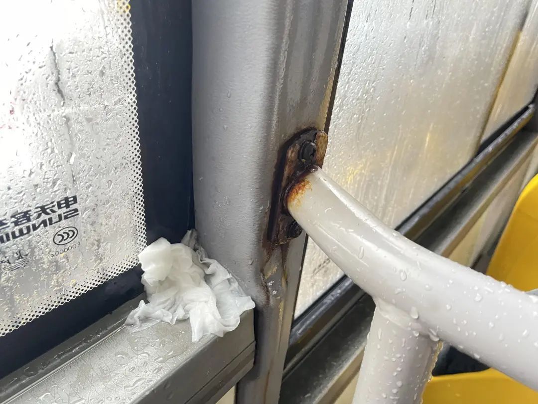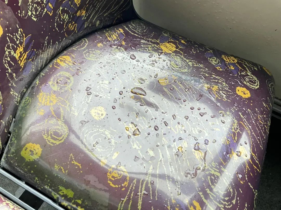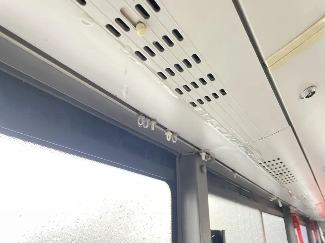 环顾四周,最终发现这些积水都是从车顶顺着缝隙滴落而成。外面下着小雨,车子里同样也在“滴水”,这让上车的乘客很无奈。反应快的及时避开了这些积水的座位,但有些乘客稍不留意,就会不慎坐在湿哒哒的椅子上,给乘坐体验增添不悦。