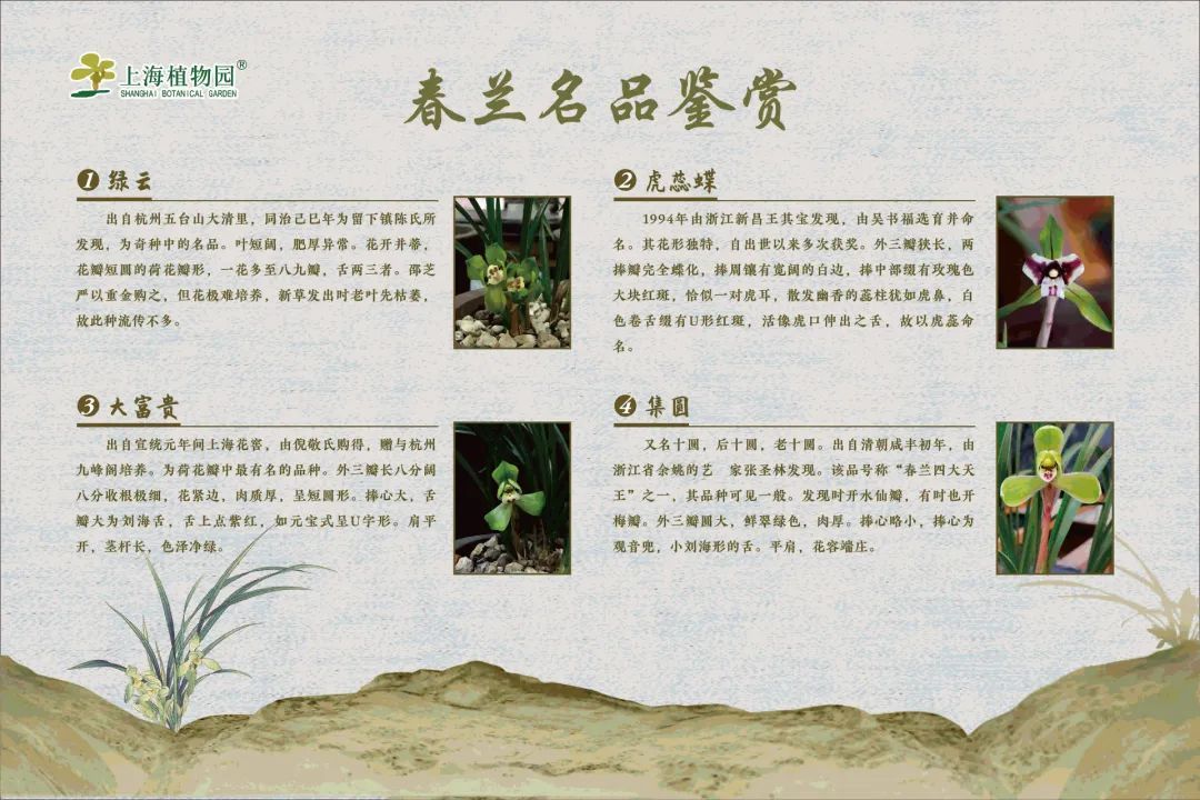 本次展览将展出不少春兰精品,如冠绝天下的‘环球荷鼎’、‘龙字’、‘绿云’等,共展示精品春兰150余个品种、500余盆次,并结合独特的山石旱景进行兰花盆景创作,凸显春兰特点和魅力。同时还有上海市主要兰花专业机构、院校及长三角著名兰蕙展示区相关专业单位送展的各式春兰佳品。