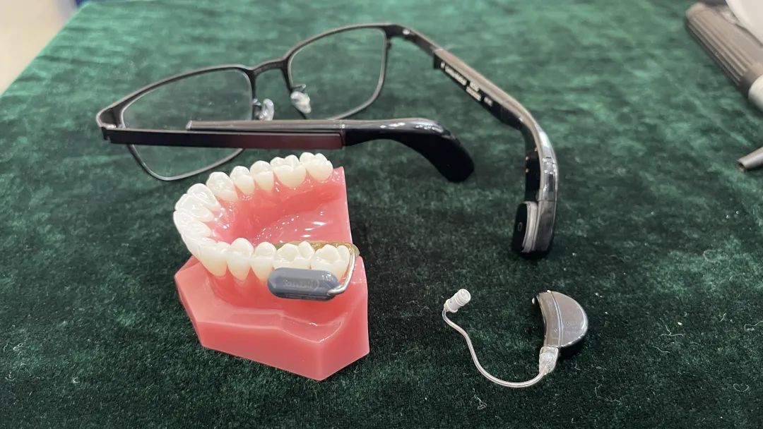 在对郑女士进行初步诊断后,医生建议她做进一步检查,如果确诊后可以尝试一些新的助听器技术,比如牙骨导助听器,这种助听器可放在牙齿上,通过震动把耳聋这侧的声音传到听力正常耳朵内,这样就可以让耳聋这边的声音信号能够传到大脑里,得到更好的聆听环境。现场,医生展示了多种不同技术的助听器。