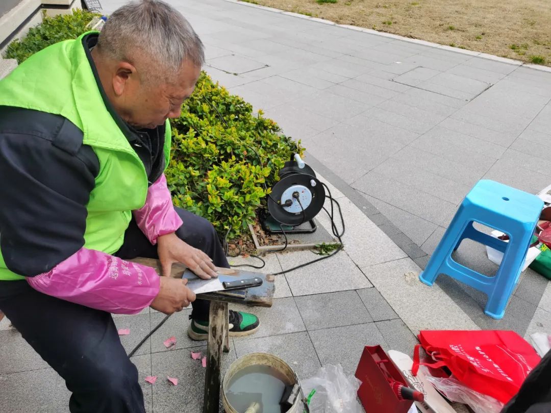 活动刚开始,各摊位前已经排起了长队。72岁的磨刀志愿者张金华早到了半个小时,菜刀加剪刀已经磨了近10把。“我退休前就在单位做维修方面的工作,退休后这点手艺还能服务居民,我蛮开心的。”张金华一边磨刀一边说。