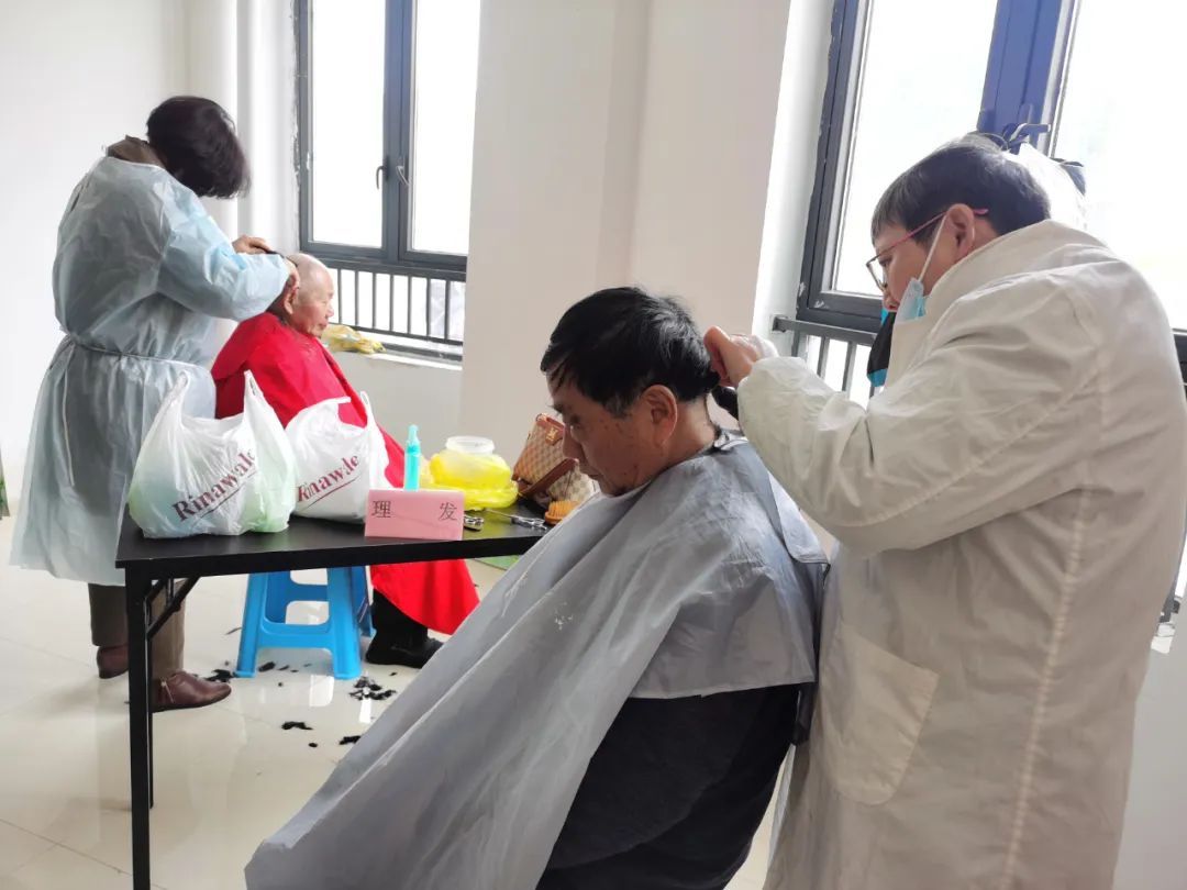 在理发摊位前,87岁的陆根明在家人陪伴下早早就来排队了。陆根明的家人说,老人年纪大了,附近比较时尚的理发店并不适合他。听说居民区组织的便民服务里有免费理发活动,老人非常开心,主动要求过来。