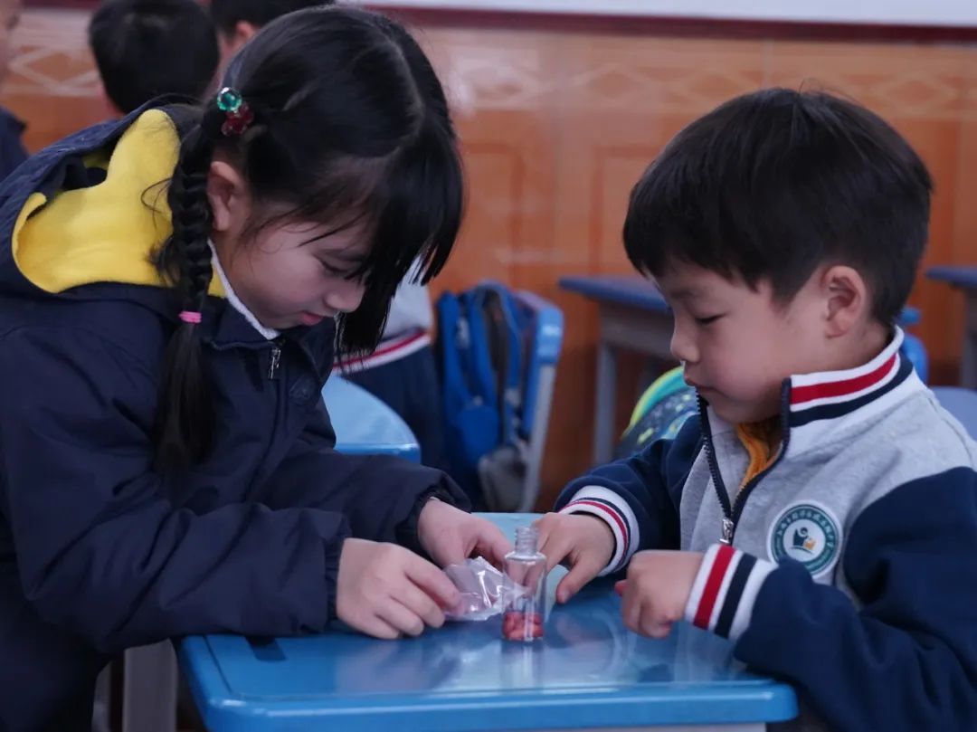 一年级是一节特别的班会课,主题为“‘植’得等待”。老师们为孩子们带来了特殊的“道具”,一包包植物种子,孩子们细心地触摸种子,观察其形态,认真聆听老师讲解植物生长的故事,用心感受生命的奇迹与等待的价值。
