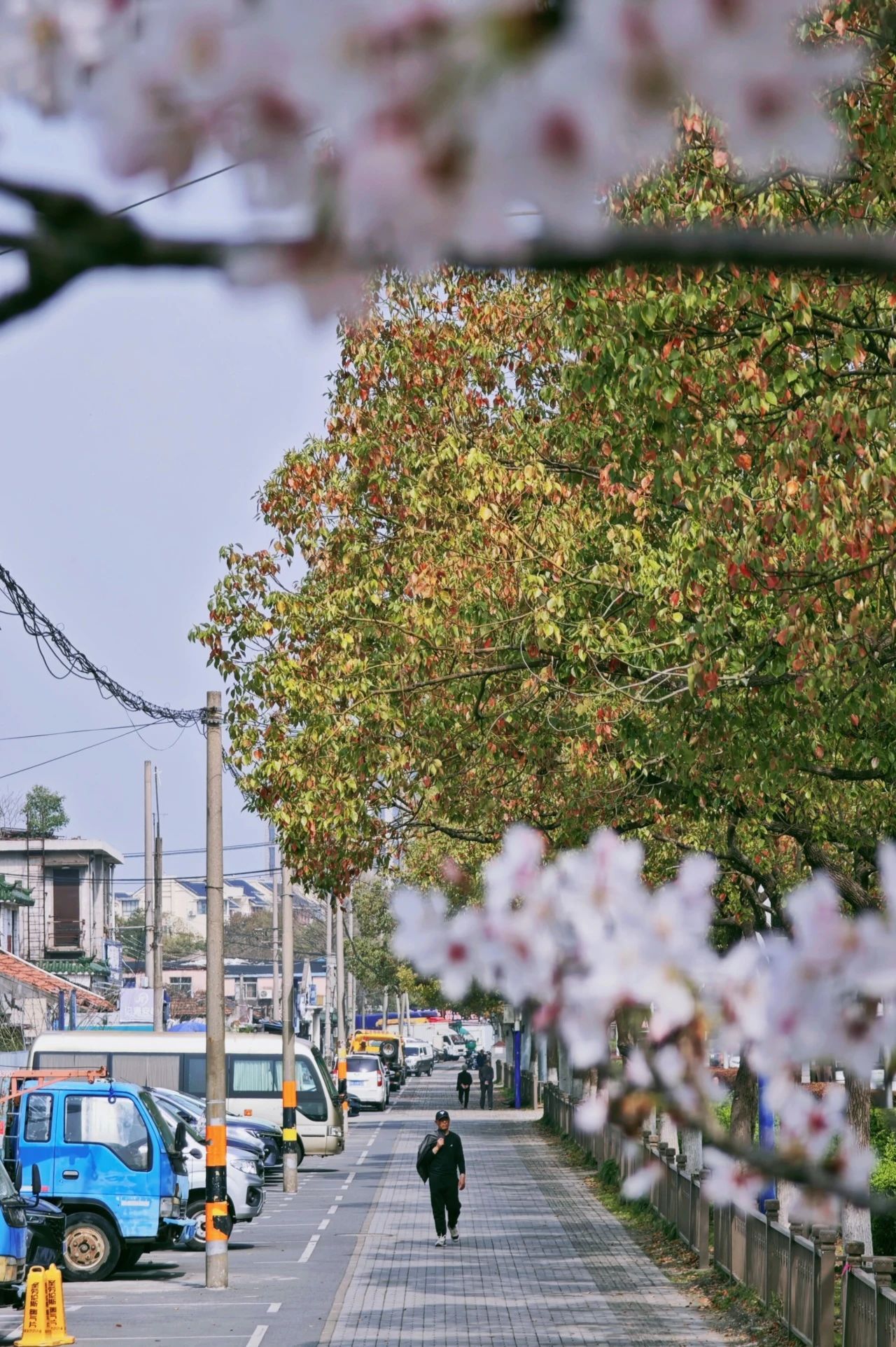 人行道上落满樱花瓣,