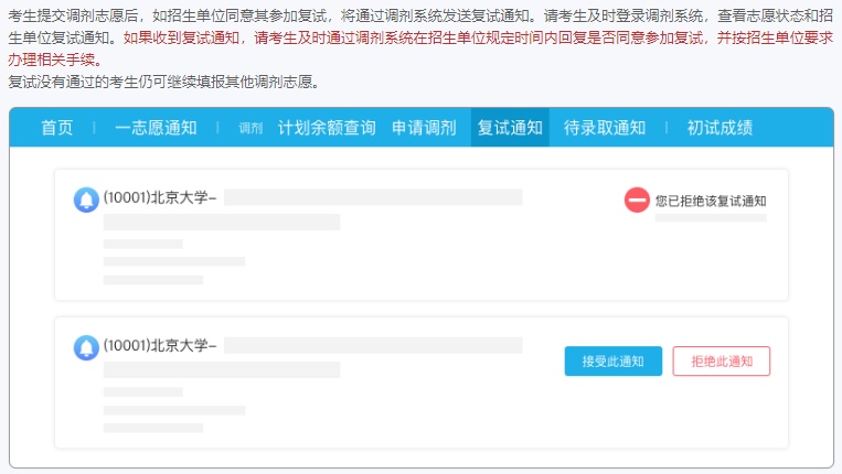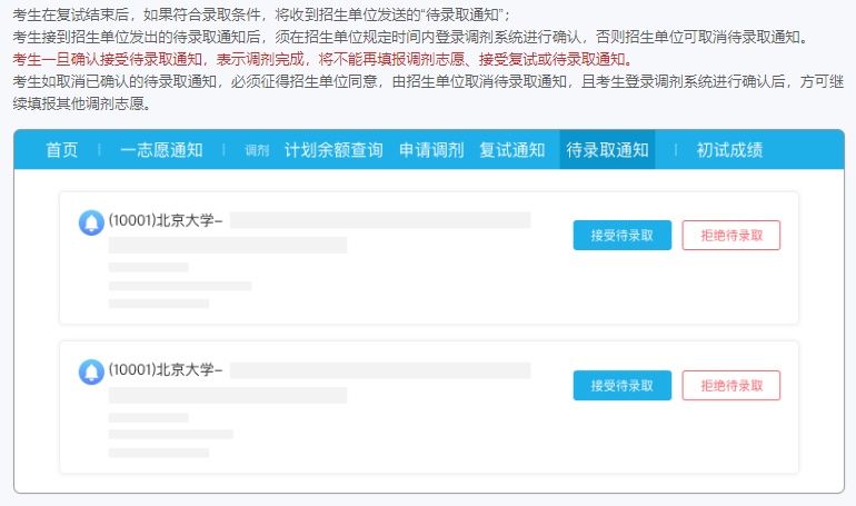 考生只能接受一个调剂志愿的待录取,一旦接受待录取通知,表示调剂完成,将不能再填报调剂志愿、接受复试或待录取通知,请慎重选择!