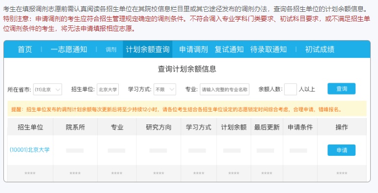 (三)考生填报调剂志愿前,请务必充分了解招生单位(含各院、系、所)的调剂专业和计划余额、接收考生调剂的时间、基本要求、工作程序、复试办法等信息,以及相关专业不同学习方式(全日制和非全日制)在培养、奖助等方面的差异,按招生单位要求填报调剂志愿。
