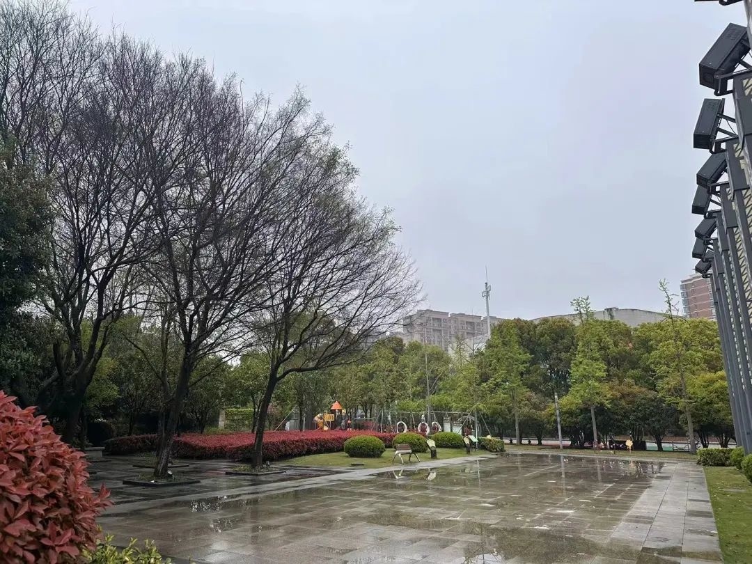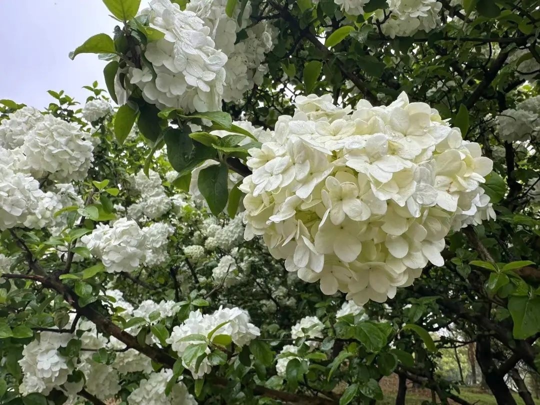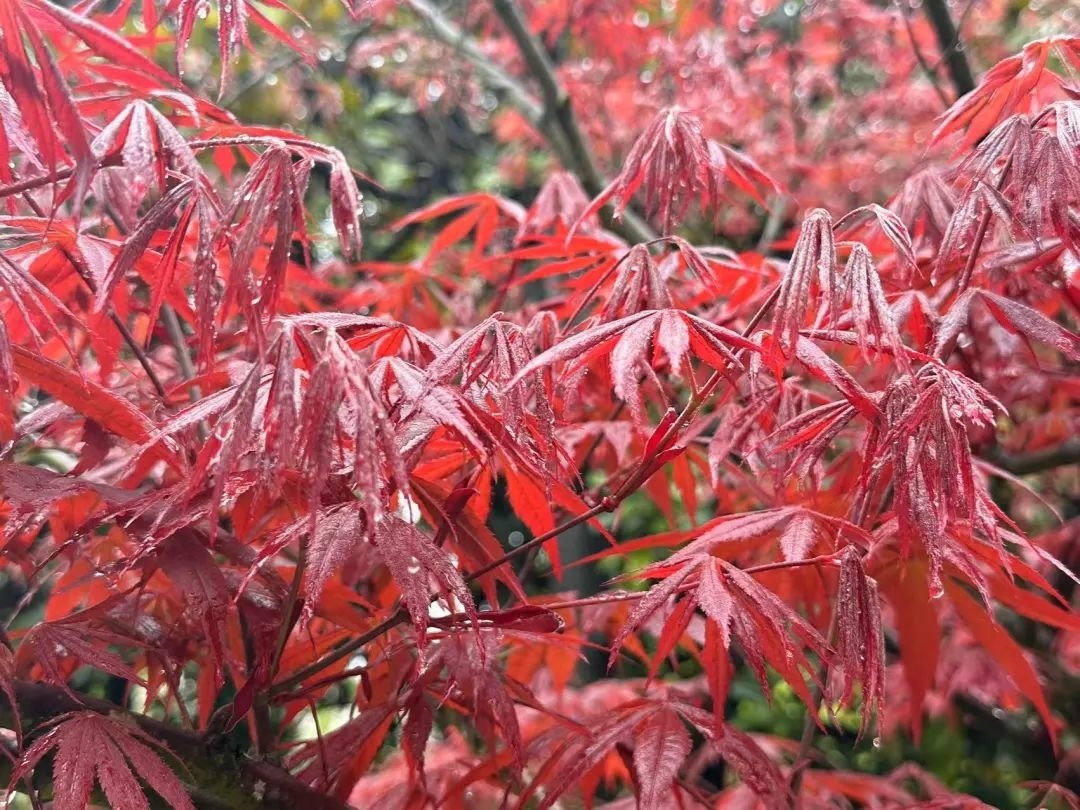 上午九时许,雨水渐止,但天空依旧阴沉。公园里,行人寥寥,较往日冷清了不少。在雨水的洗礼下,空气中弥漫着泥土的芬芳,木绣球、红枫等植株也增添了一份水润娇嫩的美感,春日气息扑面而来。