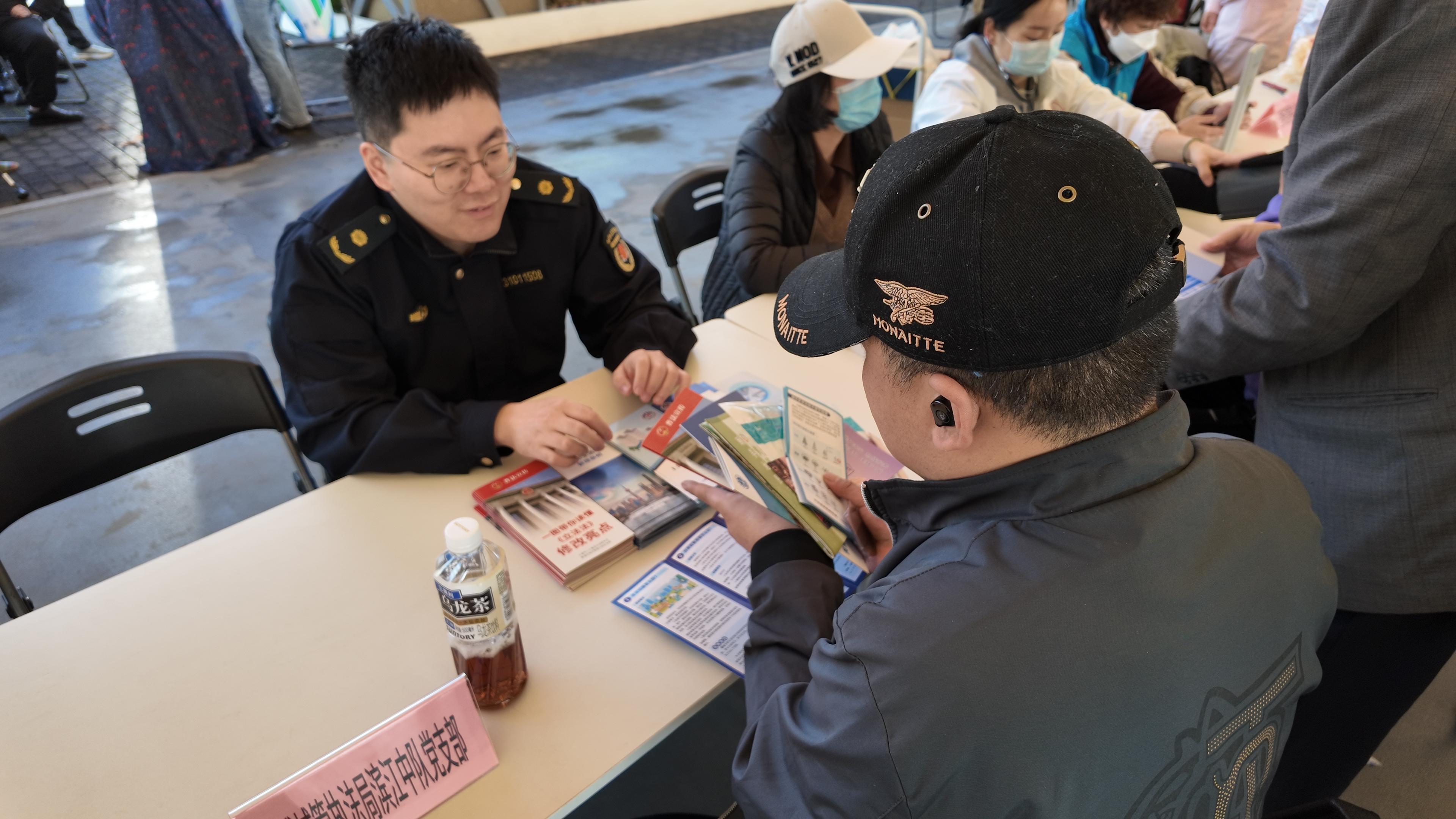 在“滨江地区支部联建活动暨为民服务活动”现场,联建单位的党员发挥自身行业的特长,为大家提供量血压、理发、法律援助、中医咨询、口腔健康咨询、工会维权等便民服务活动丰富多彩,路过的市民们更是踊跃前来。在黄浦区城管滨江地区中队党支部服务台前,执法队员认真开展普法宣传活动,并结合具体案例,向市民们娓娓道来法律法规。