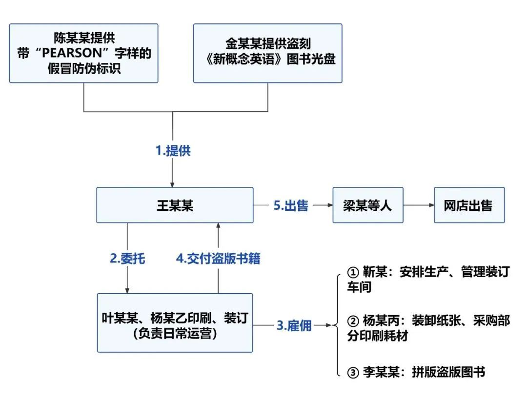 从2022年开始,王某某从陈某某处订购带有“PEARSON”的假冒注册商标的防伪标识,并委托同案关系人金某某刻印盗版《新概念英语》图书光盘,完成了非法制造假冒防伪标识、刻印盗版光盘的“上游环节”。随后,王某某将上述辅材提供给叶某某、杨某甲夫妇,先后委托叶某某、被告人杨某乙等人印刷、装订。