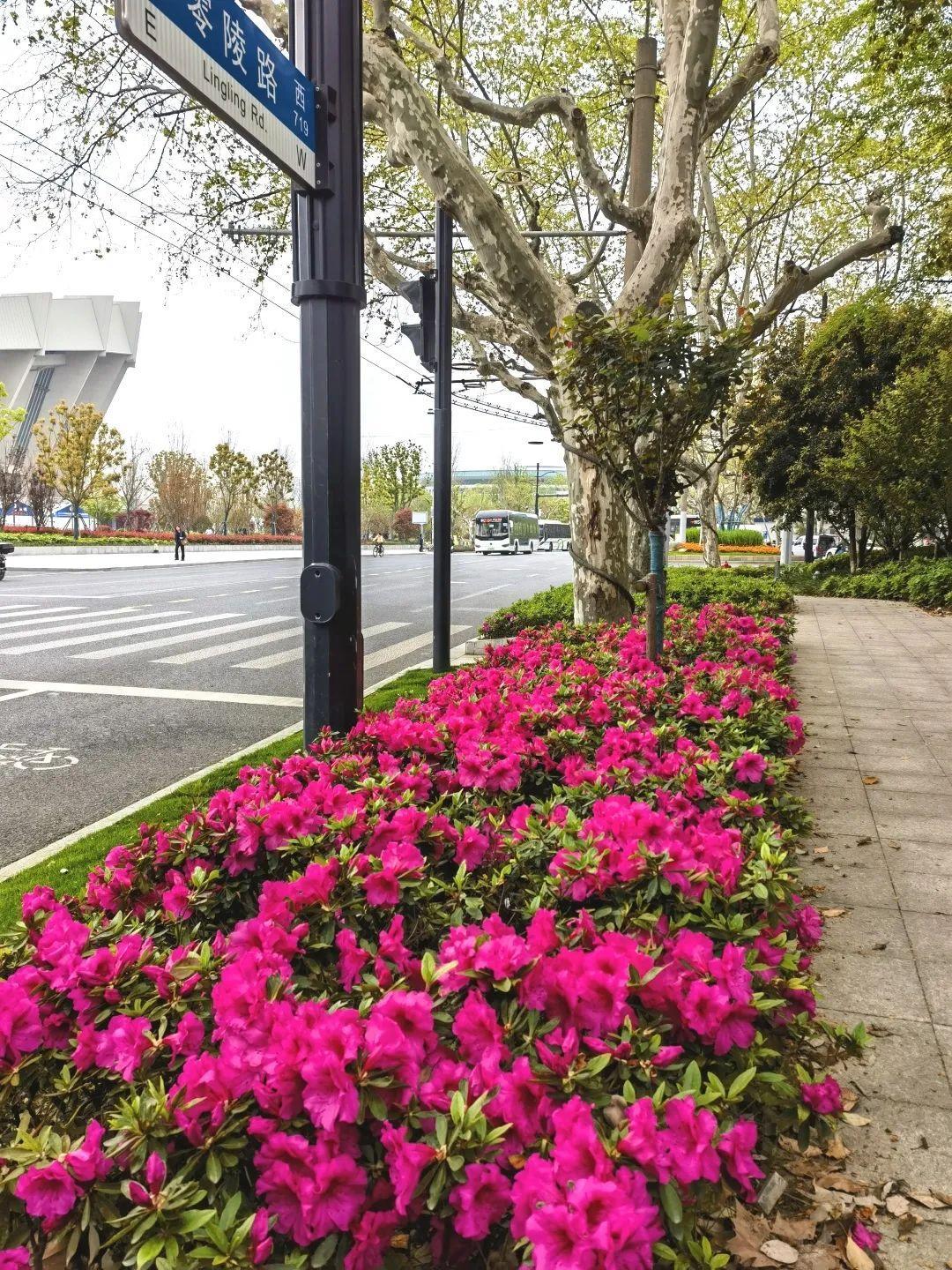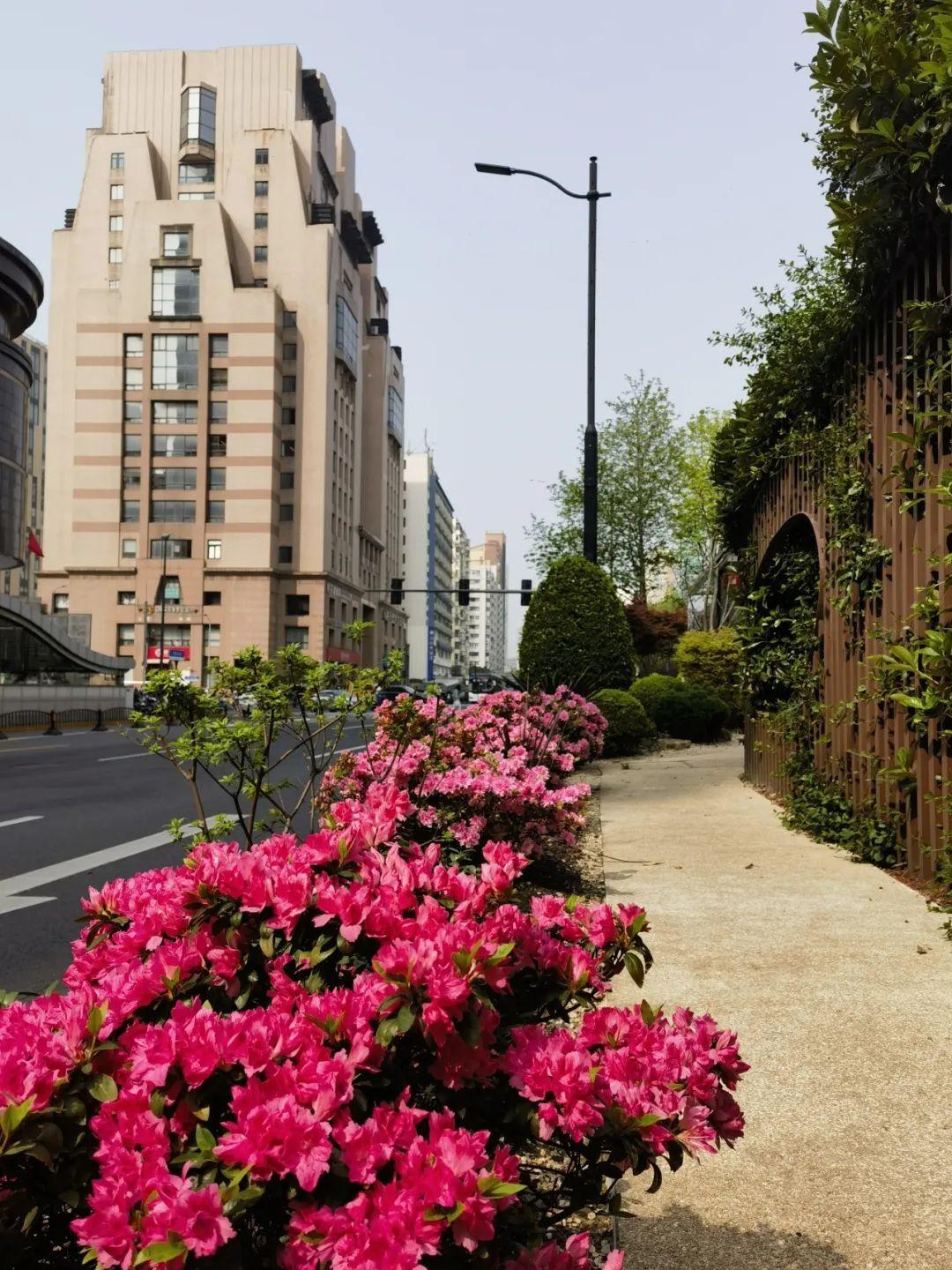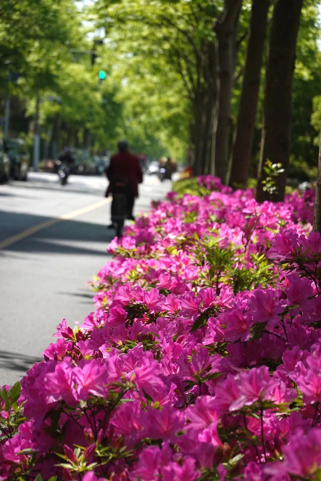在华山路道路花箱,杜鹃形成连绵起伏、浪漫无比的花海,婀娜多姿、形态各异的杜鹃花如锦似缎地铺开,把春日绚烂到了极致。
