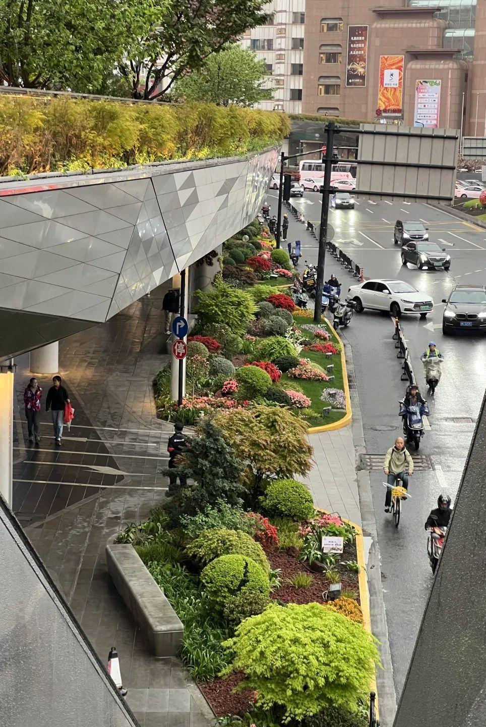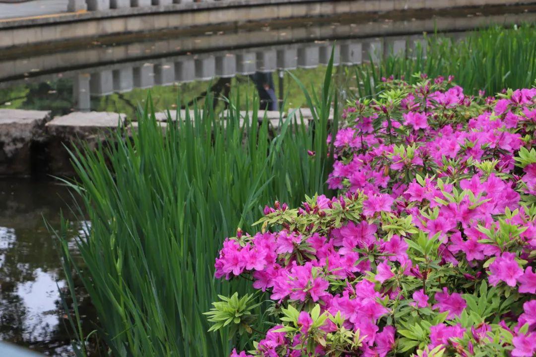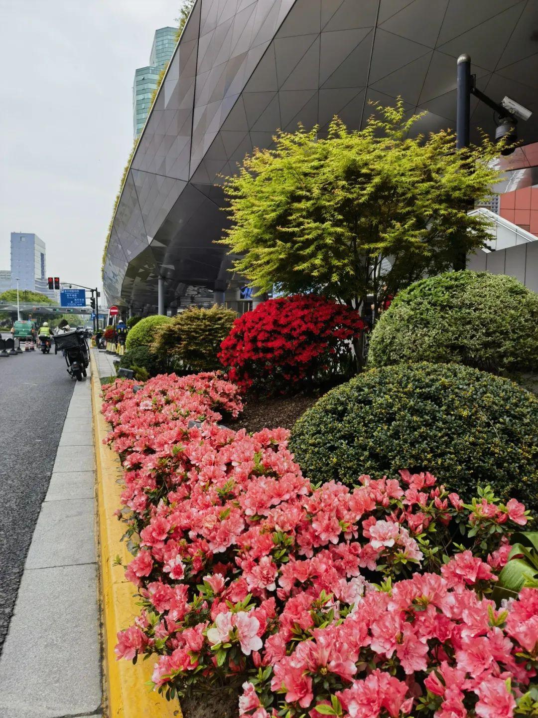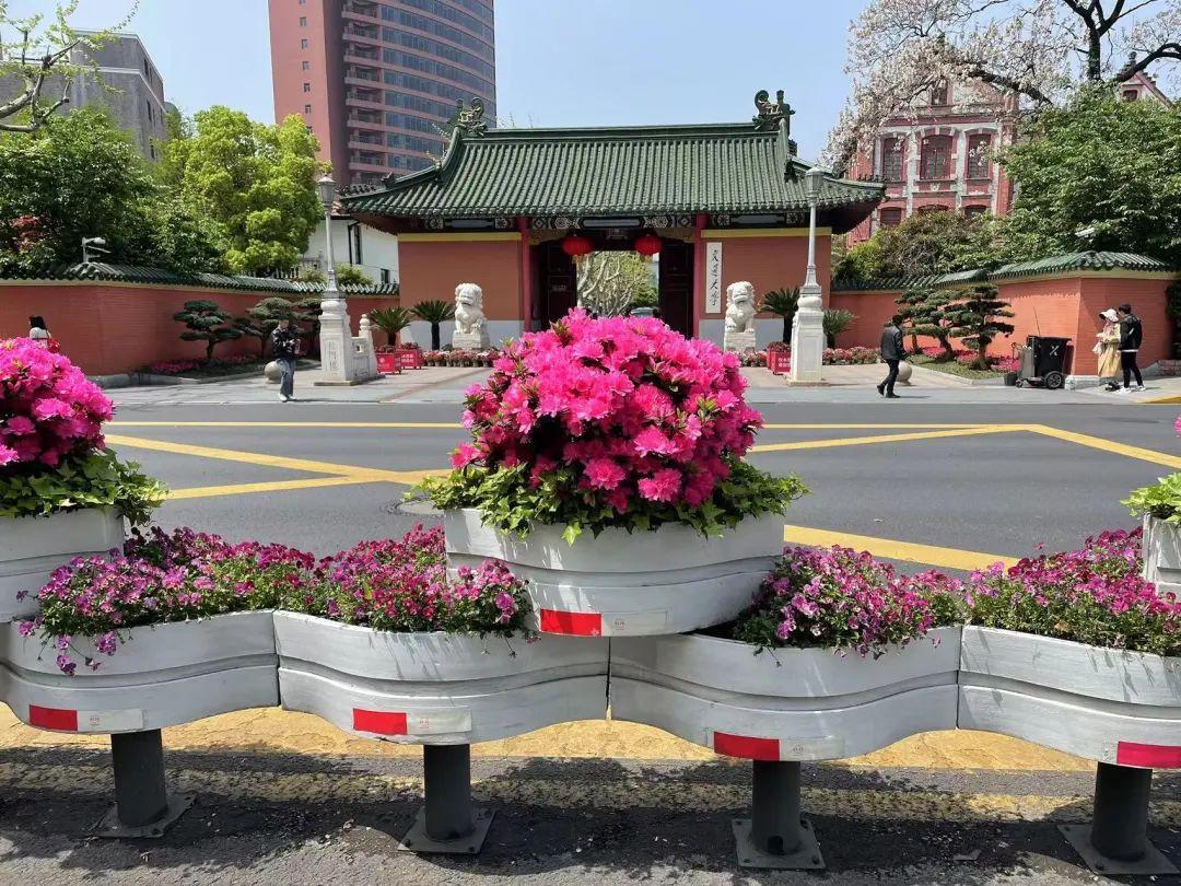 在华山路道路花箱,杜鹃形成连绵起伏、浪漫无比的花海,婀娜多姿、形态各异的杜鹃花如锦似缎地铺开,把春日绚烂到了极致。