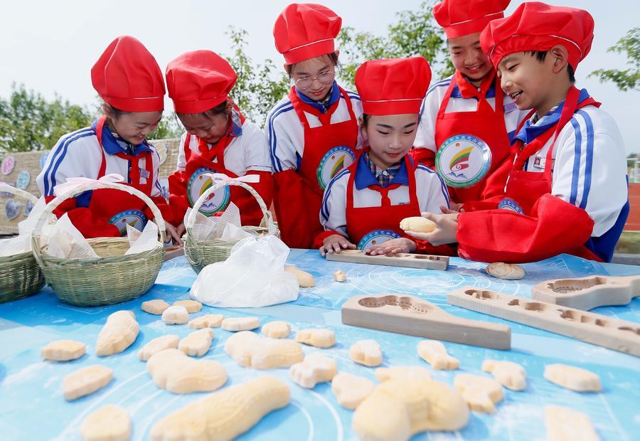 成果展示区内,12个热火朝天的“劳动总动员”展示台一一排开,有西程剪纸、官庄竹编、葛村榼子等各具特色的非物质文化遗产,有纸盘画、彩泥、折纸、水果拼盘等手工作品,还有花样馒头、包饺子、饽花等具有地方特色的面食制作……多种多样的劳动实践作品展示了我市中小学校劳动教育的丰硕成果。