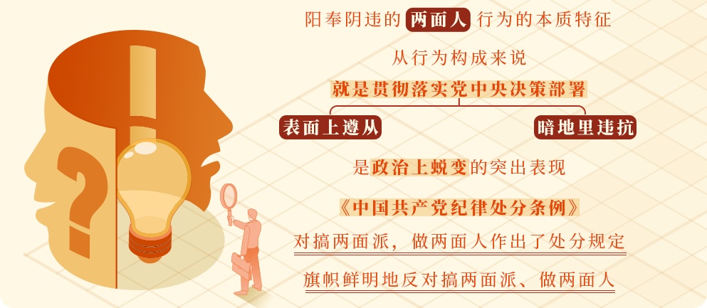 阳奉阴违的两面人行为的本质特征,从行为构成来说,就是贯彻落实党中央决策部署表面上遵从,暗地里违抗,是政治上蜕变的突出表现。