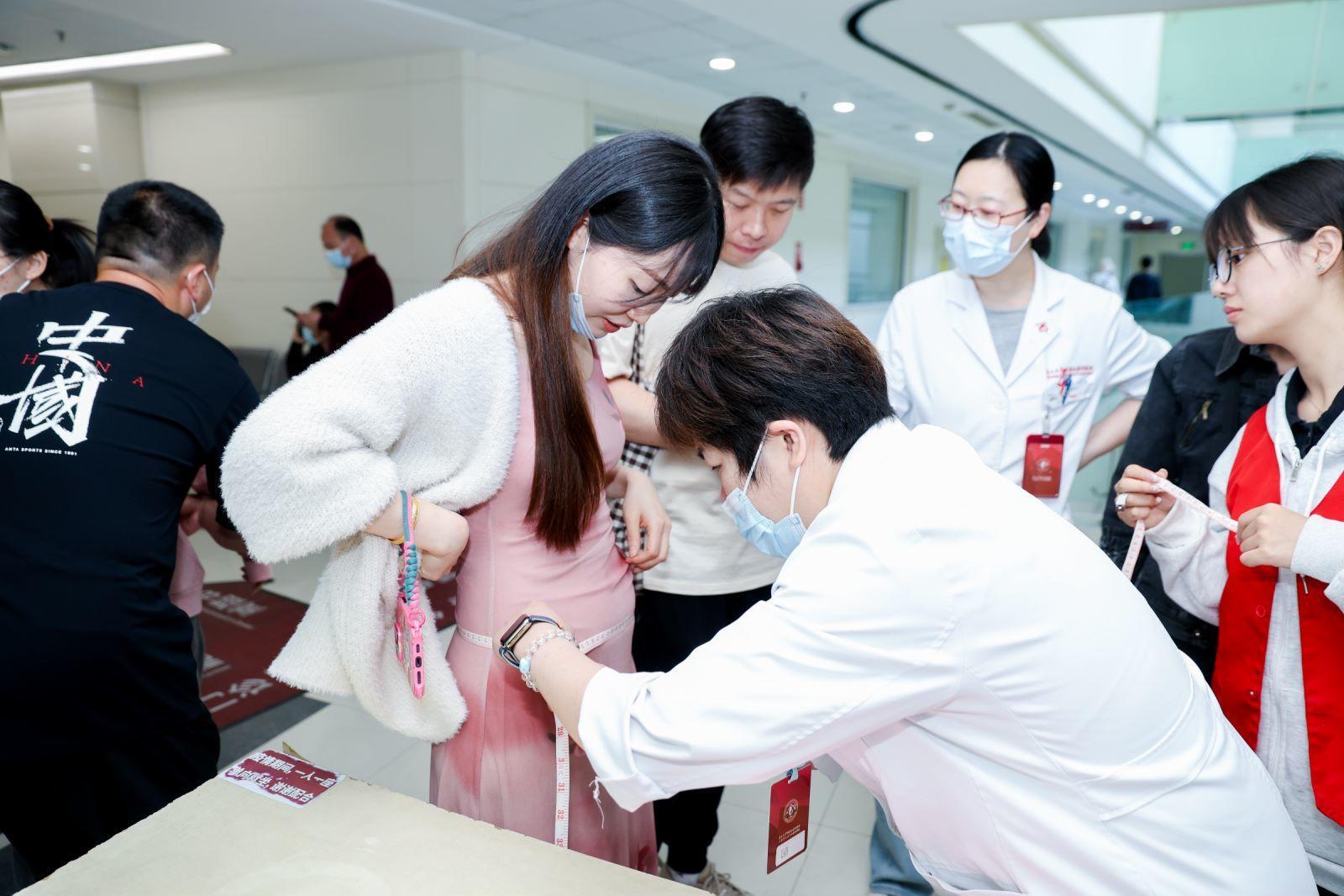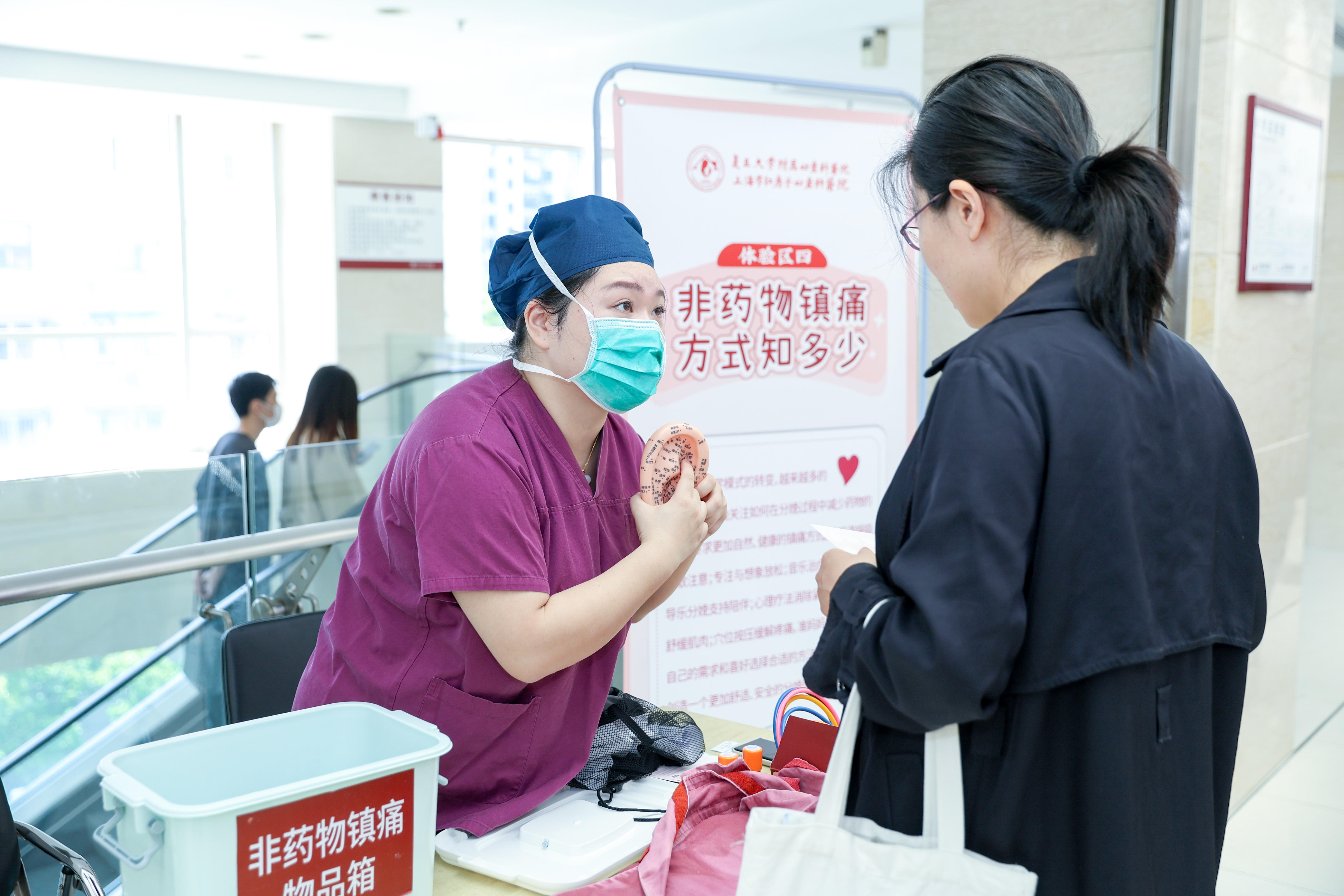 在产科门诊处,资深营养师借助模型进行现场配比、热量换算,手把手指导孕期营养搭配。在门诊二楼的体验区,通过家属吹气球来模拟孕妈腹围大小的互动,产科医生将孕期增重的要求融入其中,引导家属共同参与孕期的饮食、运动管理。而门诊三楼的分娩镇痛仪体验区内,不少准爸爸跃跃欲试,随着疼痛等级的增加,准爸爸们面露难色陆续叫停,也深深体会到分娩的不容易。实际上,为了减轻顺产妈妈的分娩疼痛,除了大家熟知的“无痛分娩”,现代产房里还有多种非药物性“镇痛神器”,来到门诊四楼的“非药物镇痛体验区”,孕妈妈们玩起套圈游戏,对花生球、减压球、豆袋、按摩珠、瑜伽球、耳穴镇痛、中医穴位按压等镇痛方式有了进一步了解。而分娩模拟体验区分别安排在产房和产科病房,真实的环境、细致的教学吸引了不少家庭,助产士结合道具为孕妈妈们揭开了顺产全程的神秘面纱,帮助大家“预习”发力方式、分娩流程等。通过五个体验区的“打卡”,不少孕妈妈表示有了医护人员的带领,边玩游戏边做好了“功课”,对顺产的焦虑也因此消除了不少。