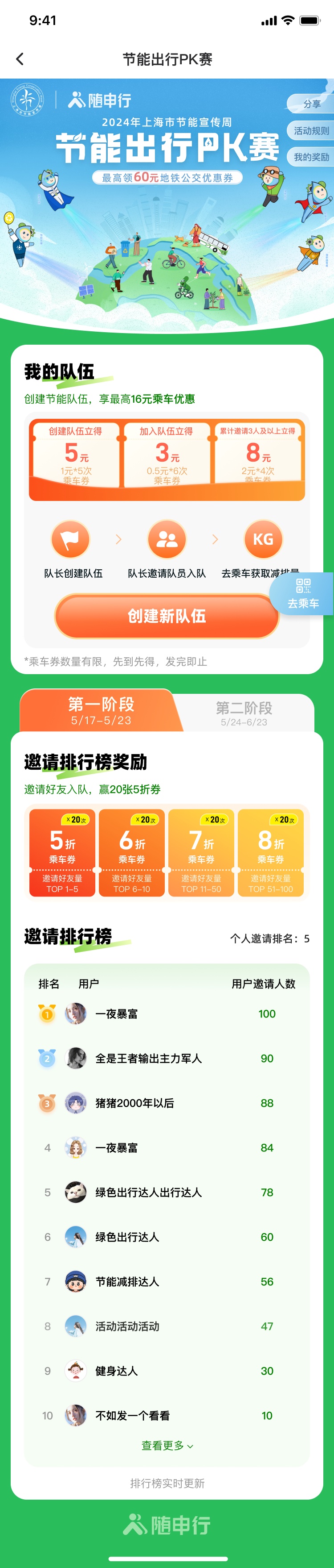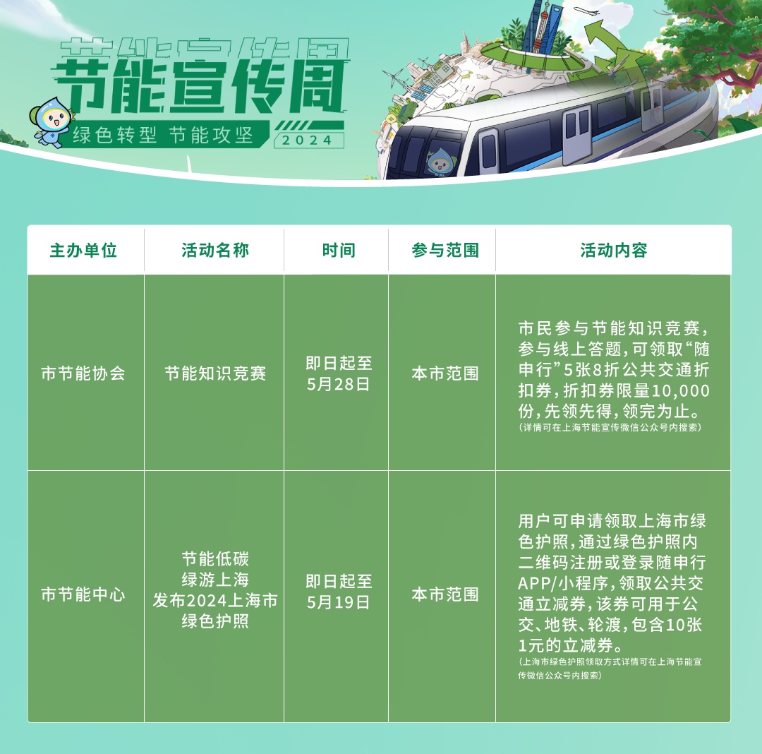 5月13日至19日,2024年上海节能宣传周正在火热进行中,面向全体市民推出“绿色低碳大礼包”。交通行业也有一大波“绿色出行”福利噢!宣传周期间,上海市绿色出行一体化平台“随申行”推出系列绿色出行福利活动,累计将派发40多万张公共交通优惠券。作为本市节能宣传周的“绿色低碳合作伙伴”,“随申行”今起向广大市民发起“节能出行PK赛”的活动邀请。“节能出行PK赛”以团队组队PK的形式展开,提高公众对绿色出行的积极性与参与度。市民可登陆“随申行”APP或微信小程序,进入“节能出行PK赛”活动页面报名,参与创建新队伍。用户可作为队长组建队伍,邀请身边好友加入。队长首次成功创建队伍即可享5元乘车优惠,队员首次加入队伍也可享3元乘车优惠。累计邀请3位好友加入队伍再得8元乘车优惠。截止5月23日,邀请好友数排名TOP100的用户最高可获得20张5折乘车券。邀得越多,福利越多哟!