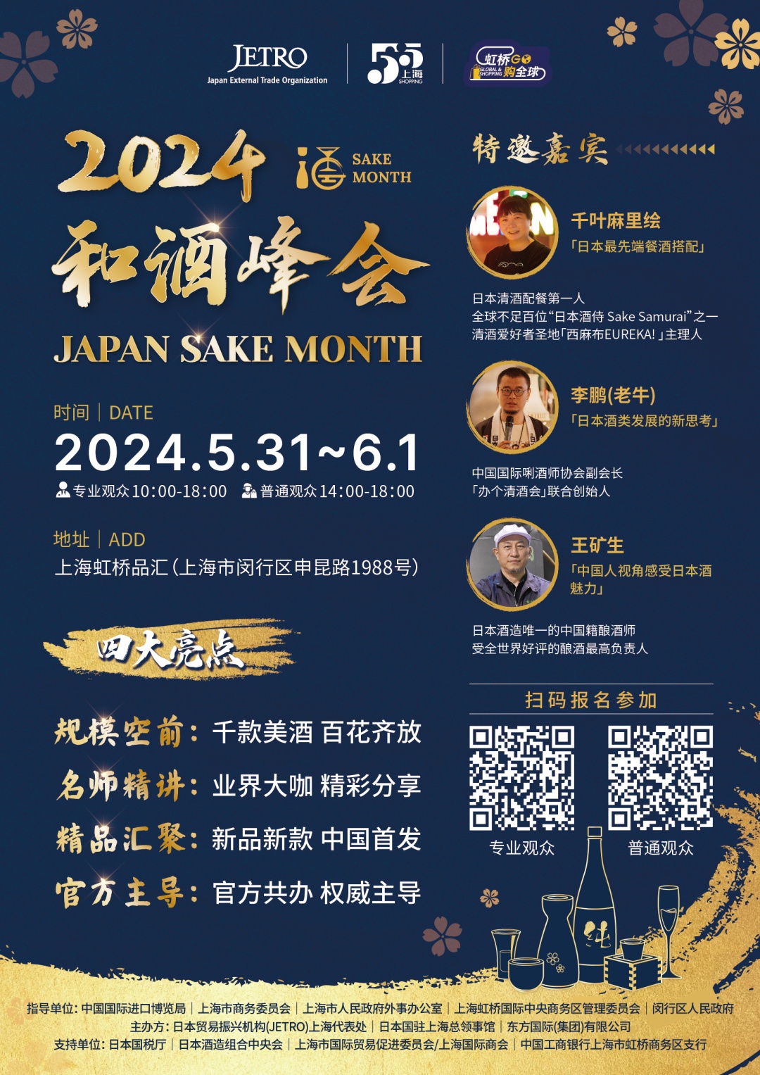 JAPAN SAKE MONTH是“五五购物节”期间持续长达1个月的系列活动之一,5月31日至6月1日,日本贸易振兴机构(JETRO)上海代表处携手中日官方机构,邀大家品鉴日本精品酒款、品尝日式美食佳肴,了解行业最新资讯并参与各种互动体验。