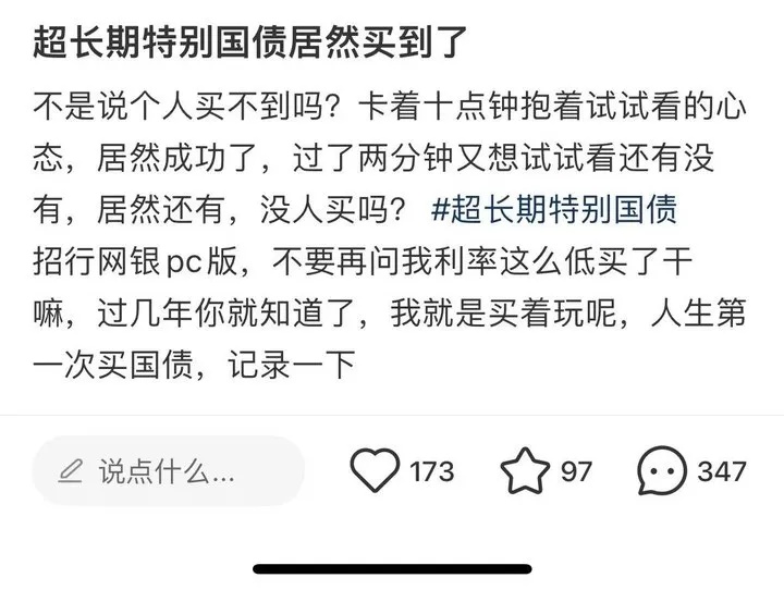 此前,每逢储蓄国债发行,各大发行机构的额度几乎被“秒抢”,很多市民想买却根本买不到。而这次,记者注意到,在社交平台上关于超长期特别国债的讨论不仅十分热闹,更有不少网友分享了自己成功的购买经历。