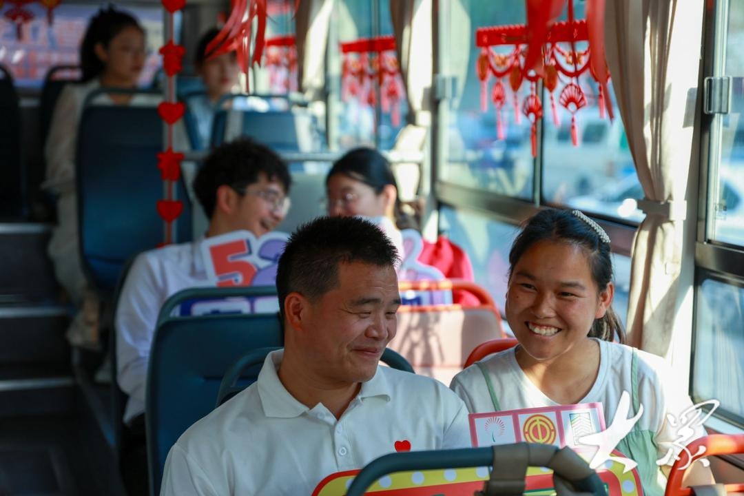 新人们乘坐新能源公交车,参与当地举办的极简复古集体婚礼暨青年联谊会活动现场。 (马红坤/摄)