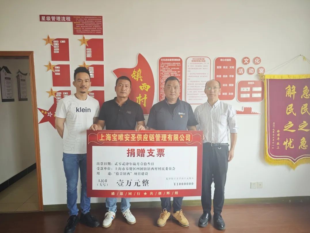 6月13日下午,上海宝唯安圣供应链管理有限公司向四团镇镇西村的“拾景镇西”项目进行定向捐赠,为镇西村产业振兴提供有力的资金支持。