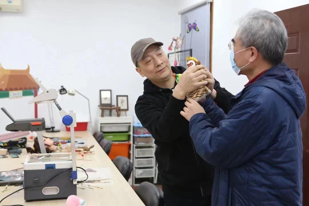 2021年12月,在打浦桥街道的支持下,项春雷于街道社区文化活动中心创立了工作室。“一直以来,打浦桥坚持把社区文化建设作为非遗传承的重要渠道,积极寻找家门口的‘非遗传承人’,推动非遗融入社区居民的日常生活。”街道营商办负责人介绍,项春雷是土生土长的打浦人,师从国家级非遗代表性传承人陈为群,与木偶结缘已有三十多年。“我们找到项老师,表达了在街道落地一个木偶工作室的想法,项老师很给力,提出了好的创意方案,双方一拍即合,工作室很快就办起来了。”