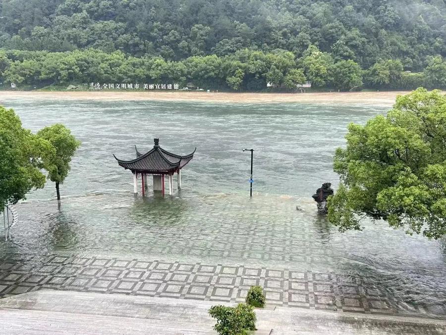 24日约13点30分,记者看到建德城区江滨公园的水位标记亭的底部已经完全被水淹没,水位已经来到了标记亭内石碑的底座位置。