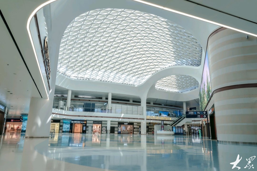 作为服务旅客、连接陆空、展示城市形象的门户,T2航站楼取意“仙海盛景、云上仙山”,与T1航站楼的“浪涌白沙”造型遥相呼应,演绎出烟台独特的山海文化。建筑面积约17.2万平方米,是T1航站楼建筑面积的两倍,分为地上三层、地下一层,建筑设计采用主楼平行于跑道的双港湾布局模式,兼顾空陆侧高效运行。新航站楼不仅颜值高,科技内涵同样出色。通过引入91台套自助设备,可实现旅客“即办、即托、即检、即出结果”。通过配备预安检闸机、毫米波安检门、行李自动回框系统等“智慧安检”建设成果,全面提升过检效率。同时,流程设置上充分借鉴国内外大型机场航站楼设计经验,采用进出港混流模式,并可通过灵活调配航站楼内9个可转换机位交通体,有效满足国际国内中转航班的使用需求,全面提高了登机桥利用率及航班靠桥率。