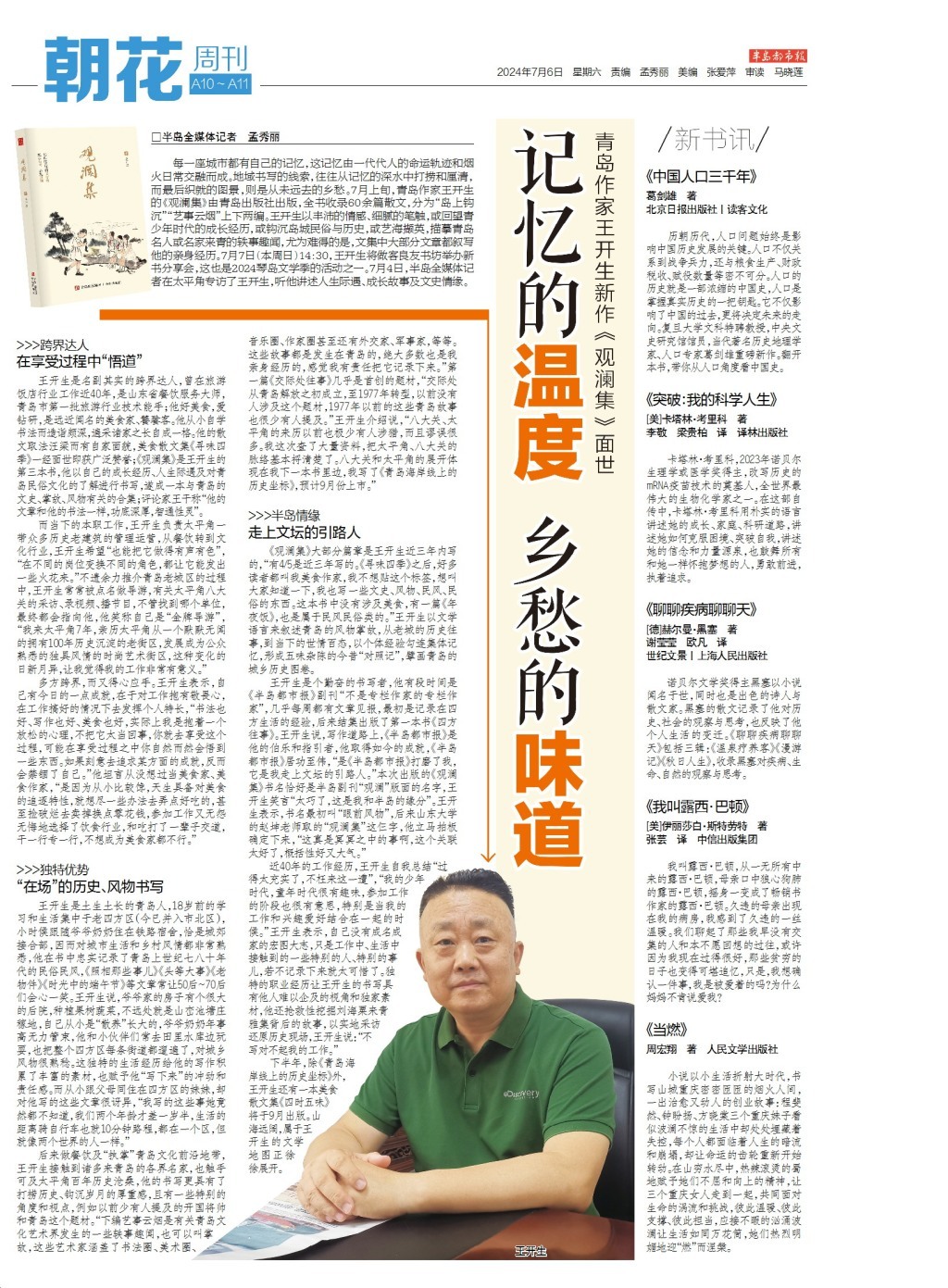 每一座城市都有自己的记忆,这记忆由一代代人的命运轨迹和烟火日常交融而成。地域书写的线索,往往从记忆的深水中打捞和厘清,而最后织就的图景,则是从未远去的乡愁。7月上旬,青岛作家王开生的《观澜集》由青岛出版社出版,全书收录60余篇散文,分为“岛上钩沉”“艺事云烟”上下两编。王开生以丰沛的情感、细腻的笔触,或回望青少年时代的成长经历,或钩沉岛城民俗与历史,或艺海撷英,描摹青岛名人或名家来青的轶事趣闻,尤为难得的是,文集中大部分文章都叙写他的亲身经历。7月7日(本周日)14:30,王开生将做客良友书坊举办新书分享会,这也是2024琴岛文学季的活动之一。7月4日,半岛全媒体记者在太平角专访了王开生,听他讲述人生际遇、成长故事及文史情缘。