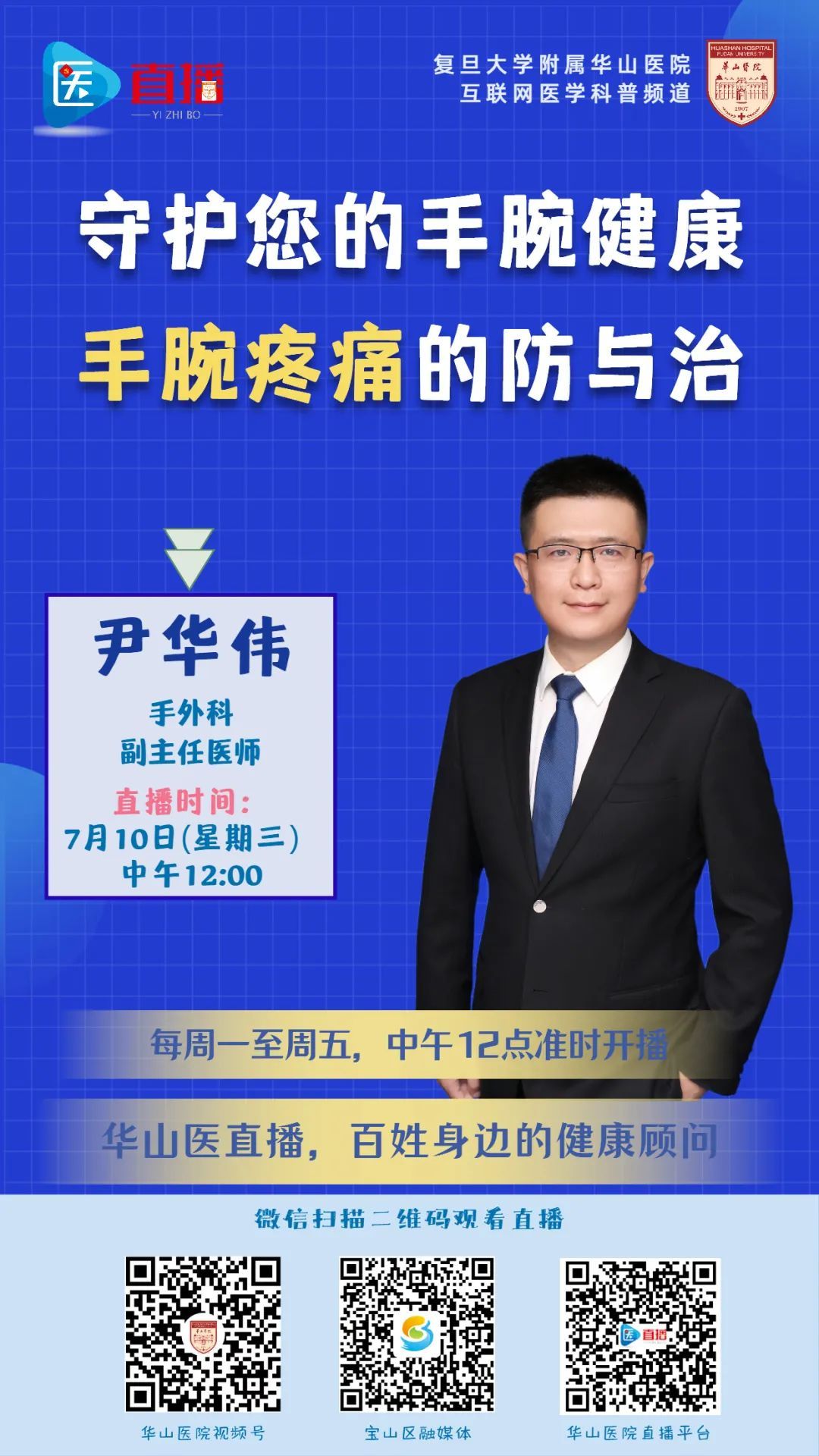 尹华伟,手外科副主任医师,擅长腕关节疼痛的微创诊治,臂丛神经损伤、偏瘫上肢外科治疗的新技术与手、腕、臂等上肢区域的麻木、疼痛、肌肉麻痹、肿瘤等疾病。