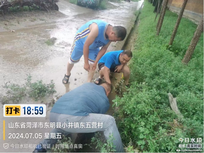 7月5日暴雨来临后,第一书记与村两委冒雨查看村内坑塘、排水沟以及各路口积水情况,实地查找堵点进行疏通;与村两委第一时间召开紧急会议,按片区摸排村内孤寡老人、孕产妇、残疾人和留守儿童等情况,确保无意外风险;重点实地走访村内危房,评估带来的风险,做好应对方案。