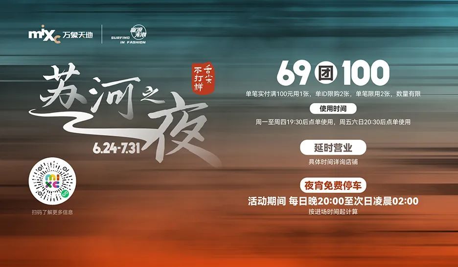 即日起至7月31日,上海苏河湾万象天地“苏河之夜”活动推出“69元团100元”夜宵美食团购、每日晚20:00至次日凌晨2:00夜间免费停车礼遇,更有多家餐厅酒吧延长营业时间至夜间,设置外籍人士友好双语菜单,邀八方来客共襄盛宴。