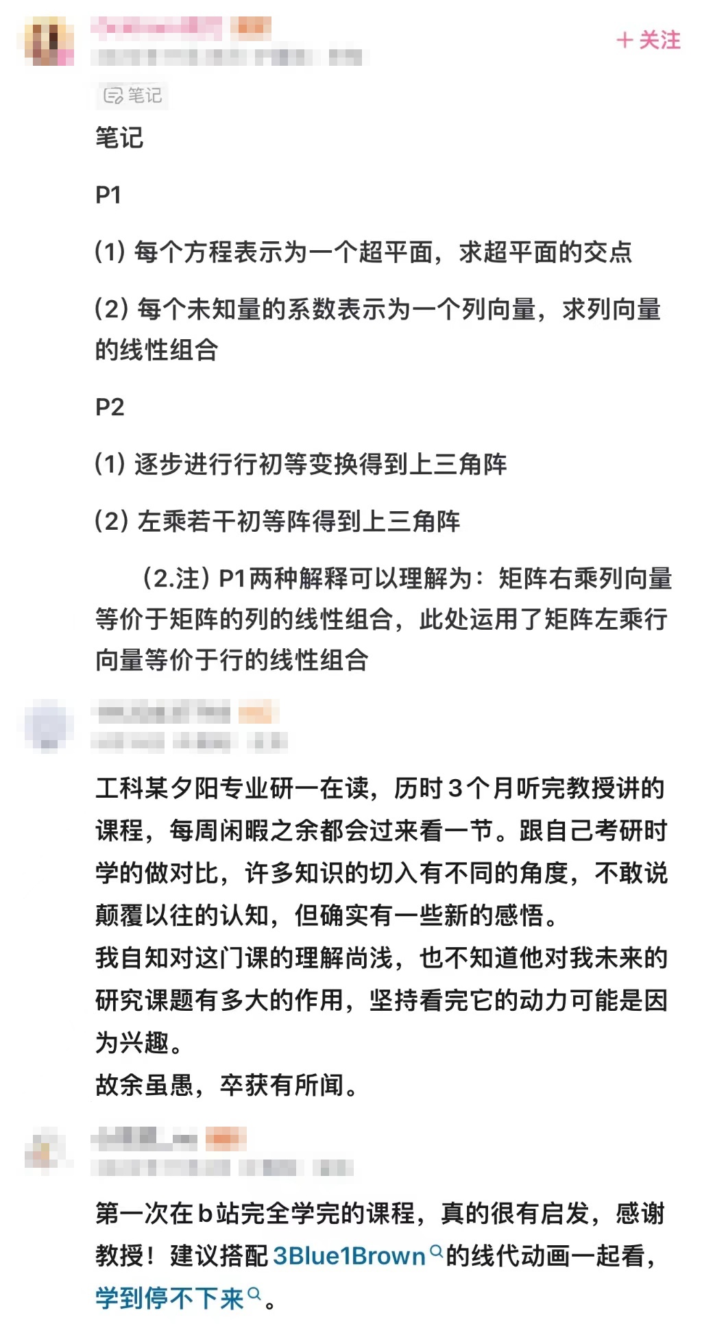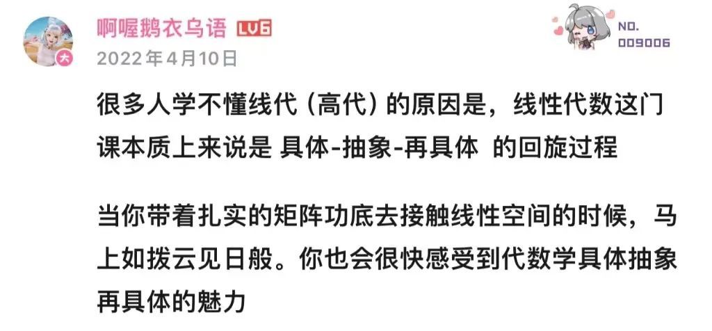 对数学的兴趣,驱使了一部分年轻人自觉地走向网络数学课。B站2022年上传的“麻省理工MIT线性代数”全英语课程拥有431.1万播放量,在评论区里,网友“啊喔鹅衣乌语”发长帖道来了数学的魅力。