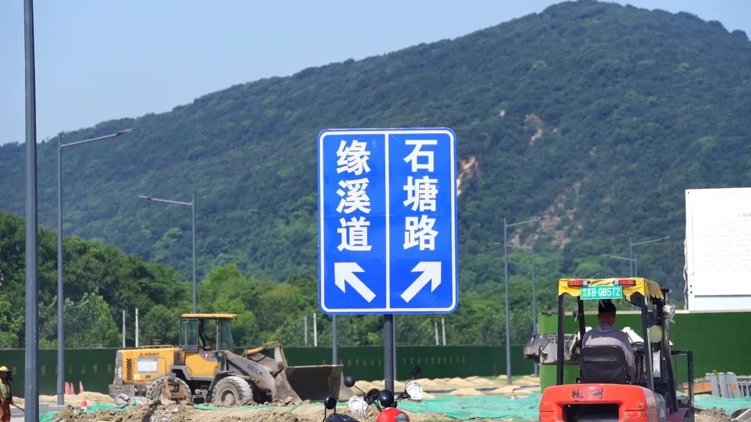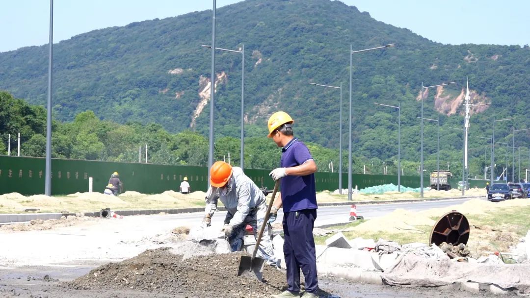 上午9时,烈日炙烤大地,记者从石塘路附近走进项目工地,压路机、混凝土搅拌机和工人们正忙碌着。