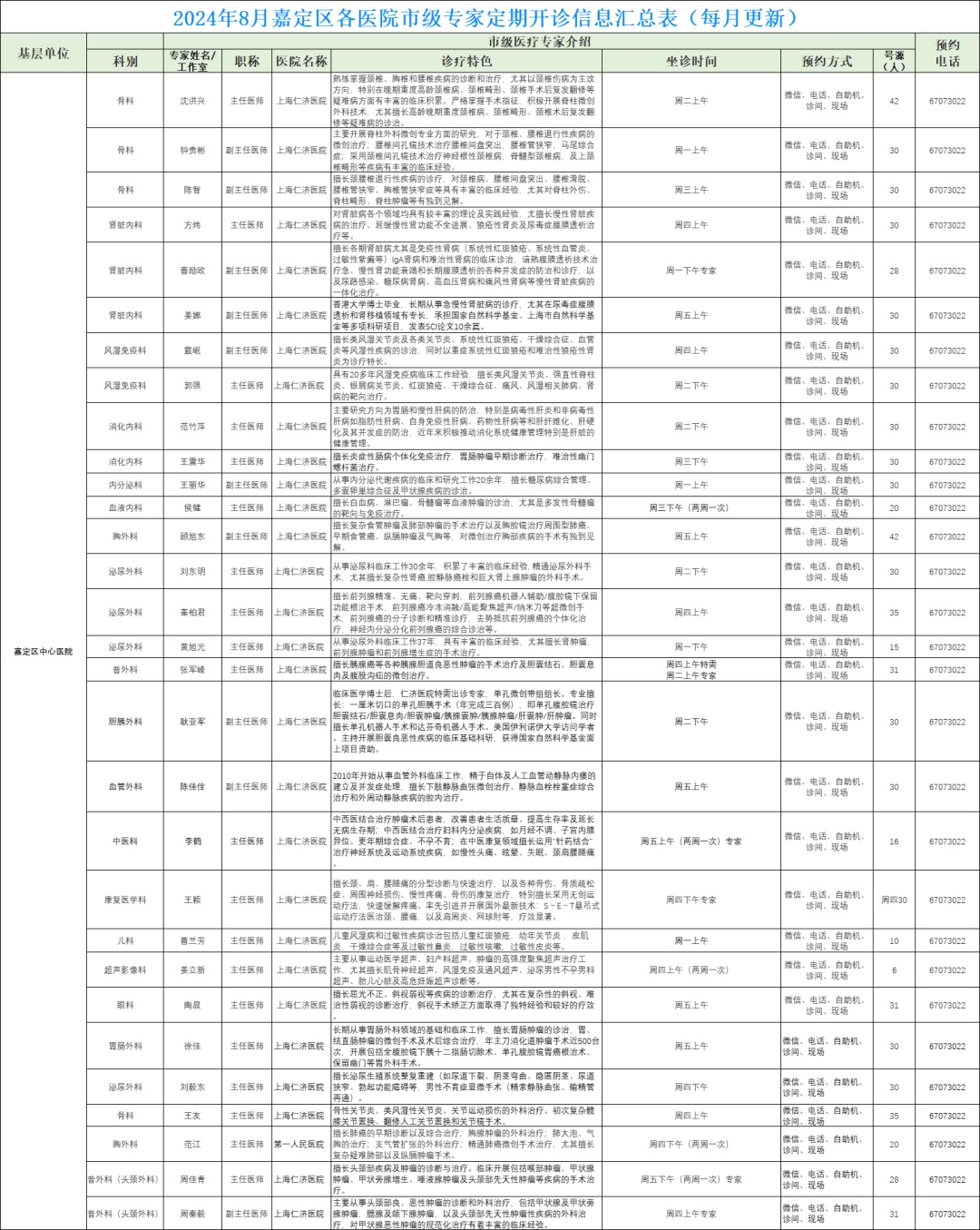 2024年8月嘉定区各医院市级专家