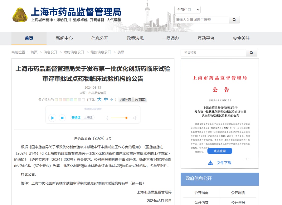 为落实党中央、国务院关于加快发展新质生产力的工作部署,持续深化药品审评审批制度改革,2024年7月31日,国家药监局印发《优化创新药临床试验审评审批试点工作方案》的通知,旨在探索建立全面提升药物临床试验质量和效率的工作制度和机制,实现30个工作日内完成创新药临床试验申请审评审批,缩短药物临床试验启动用时。
