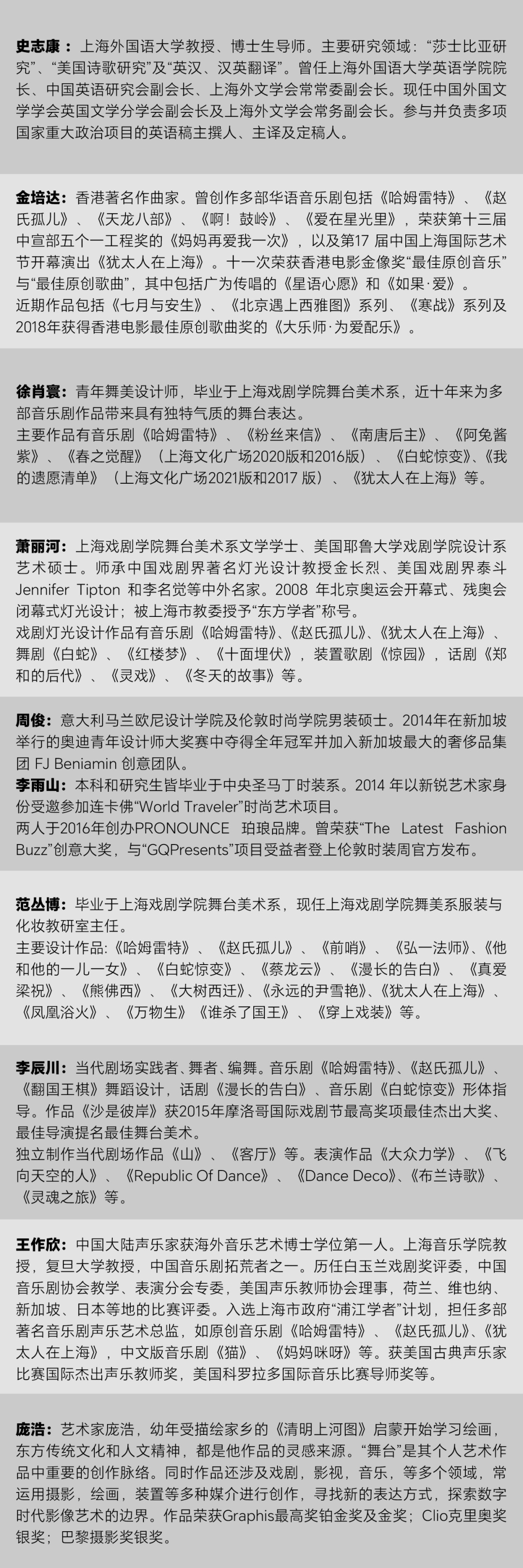 来自国内的三十多位青年演员犹如璀璨繁星,其中不乏实力出众的新生力量,徐泽辉、王智威饰演麦克德夫;王梓庭、周惠怡、陈檀雅饰演麦克德夫夫人;赵伟钢、徐嘉乔饰演班珂;胡芳洲饰演邓肯;庞盛之、马灵奇、殷浩伦等优秀演员都将在剧中奉献精彩表演。各国卡司将以多样化的组合在1862的舞台上绽放无与伦比的戏剧光彩。