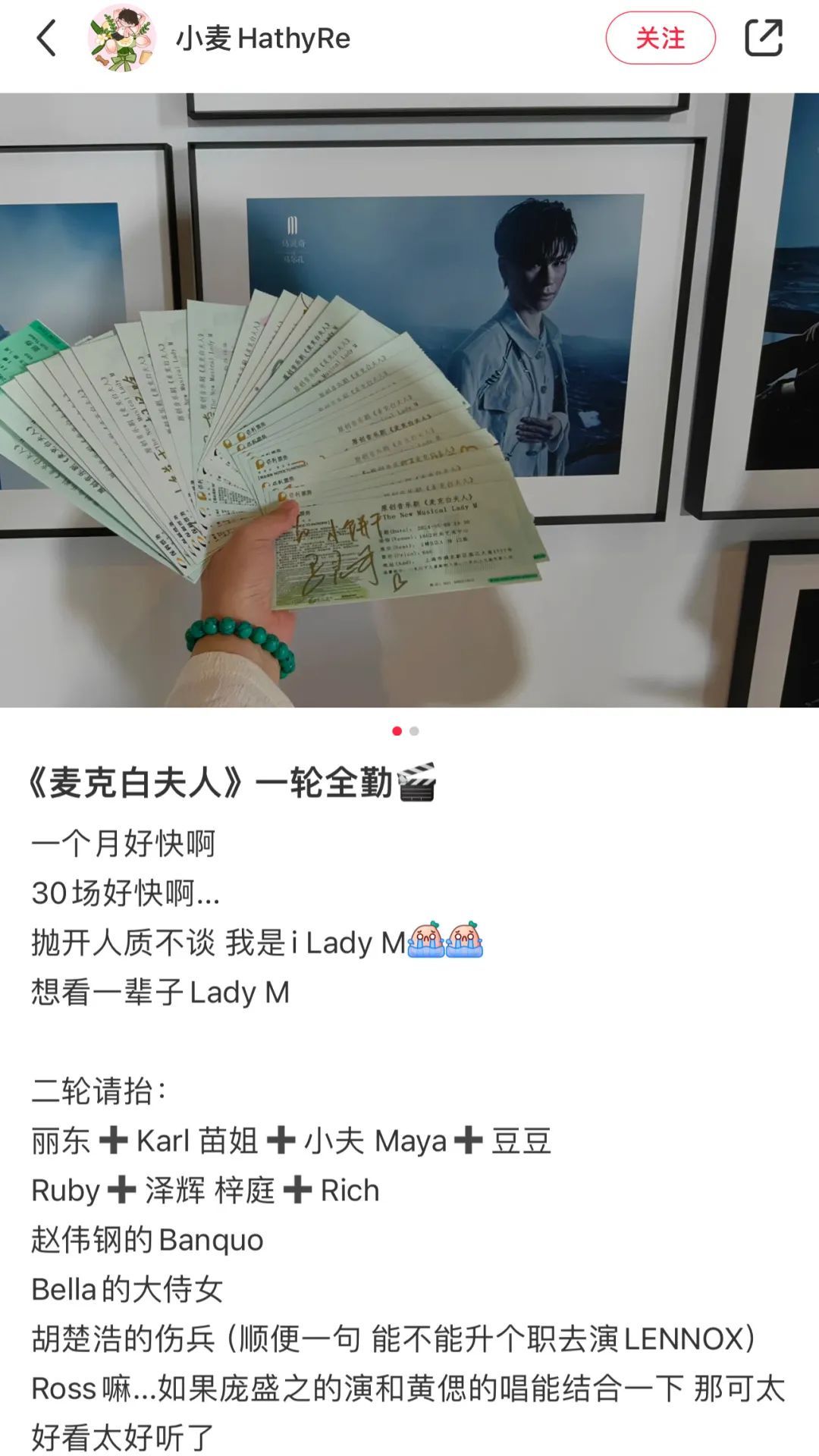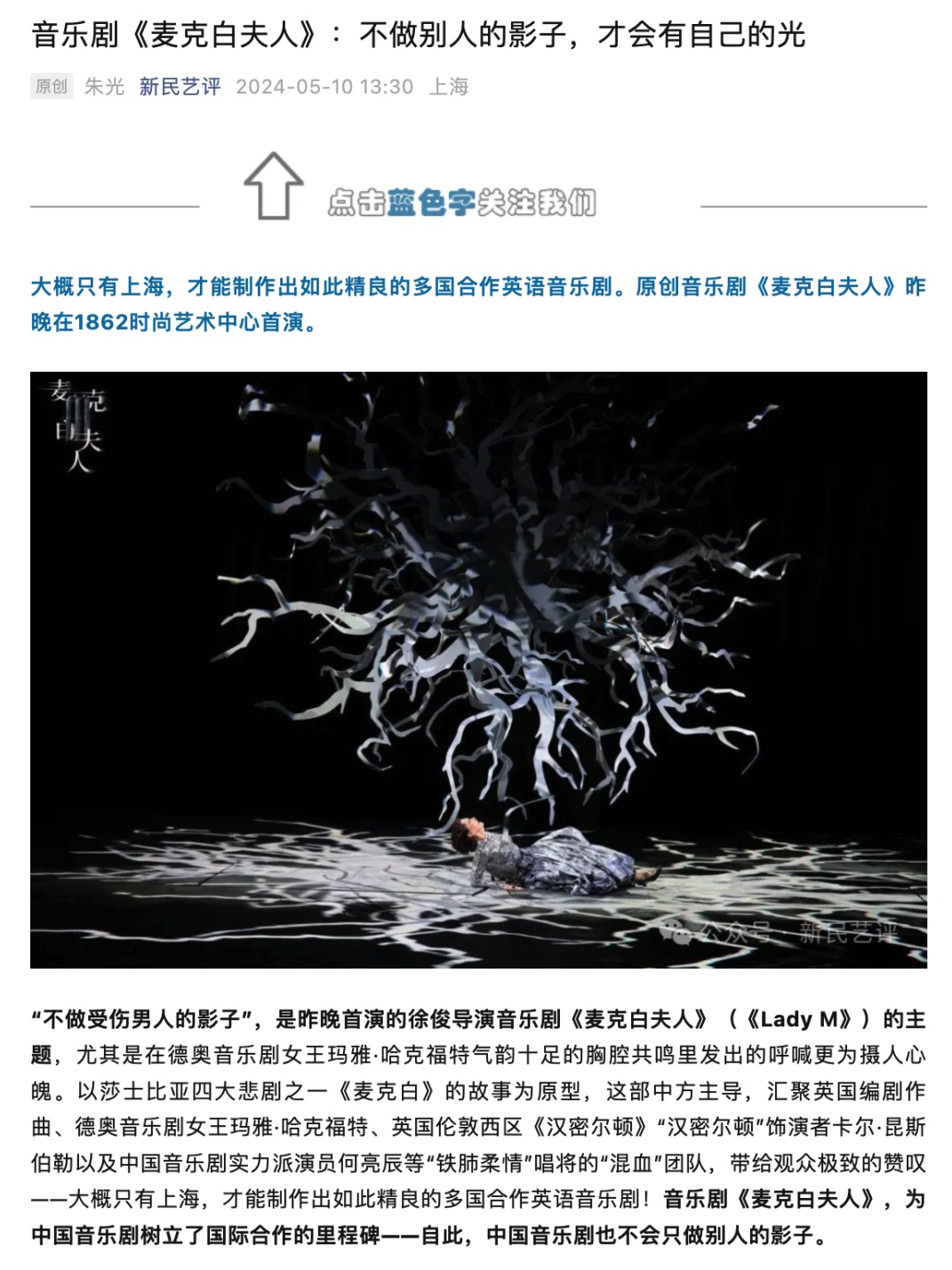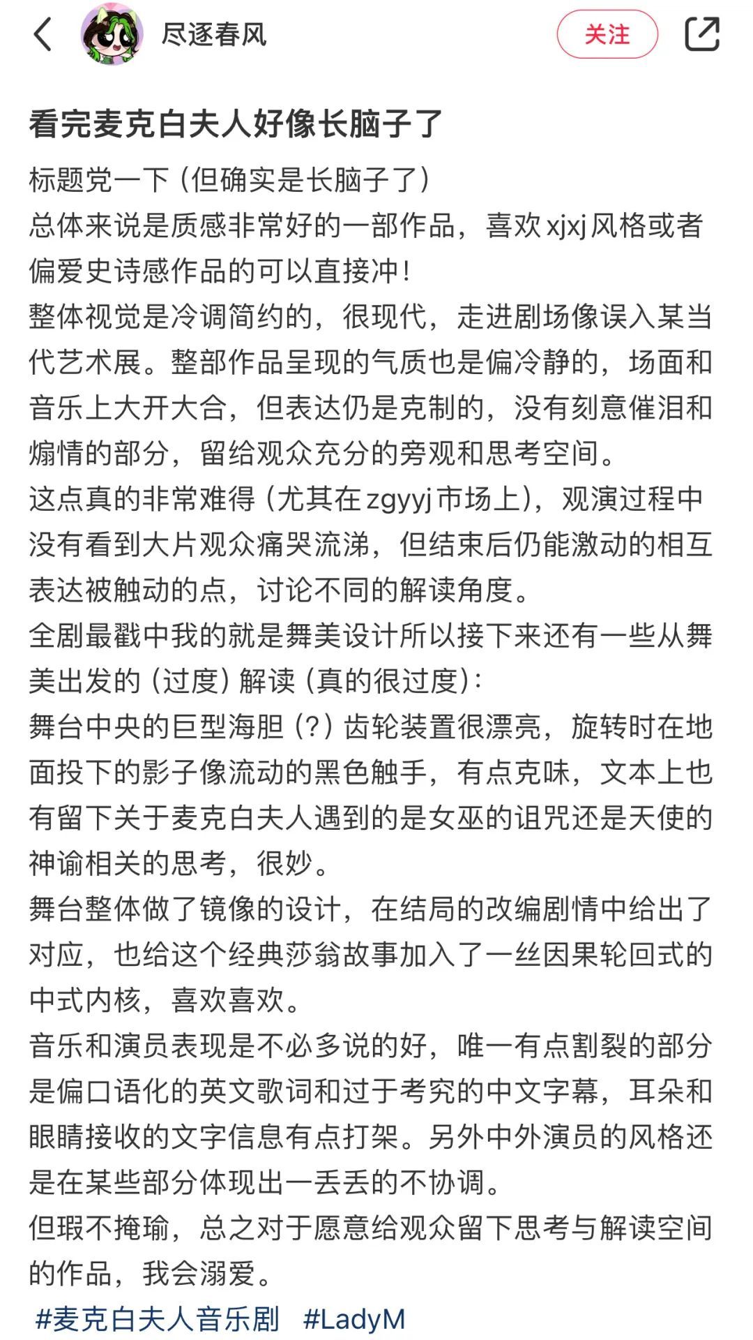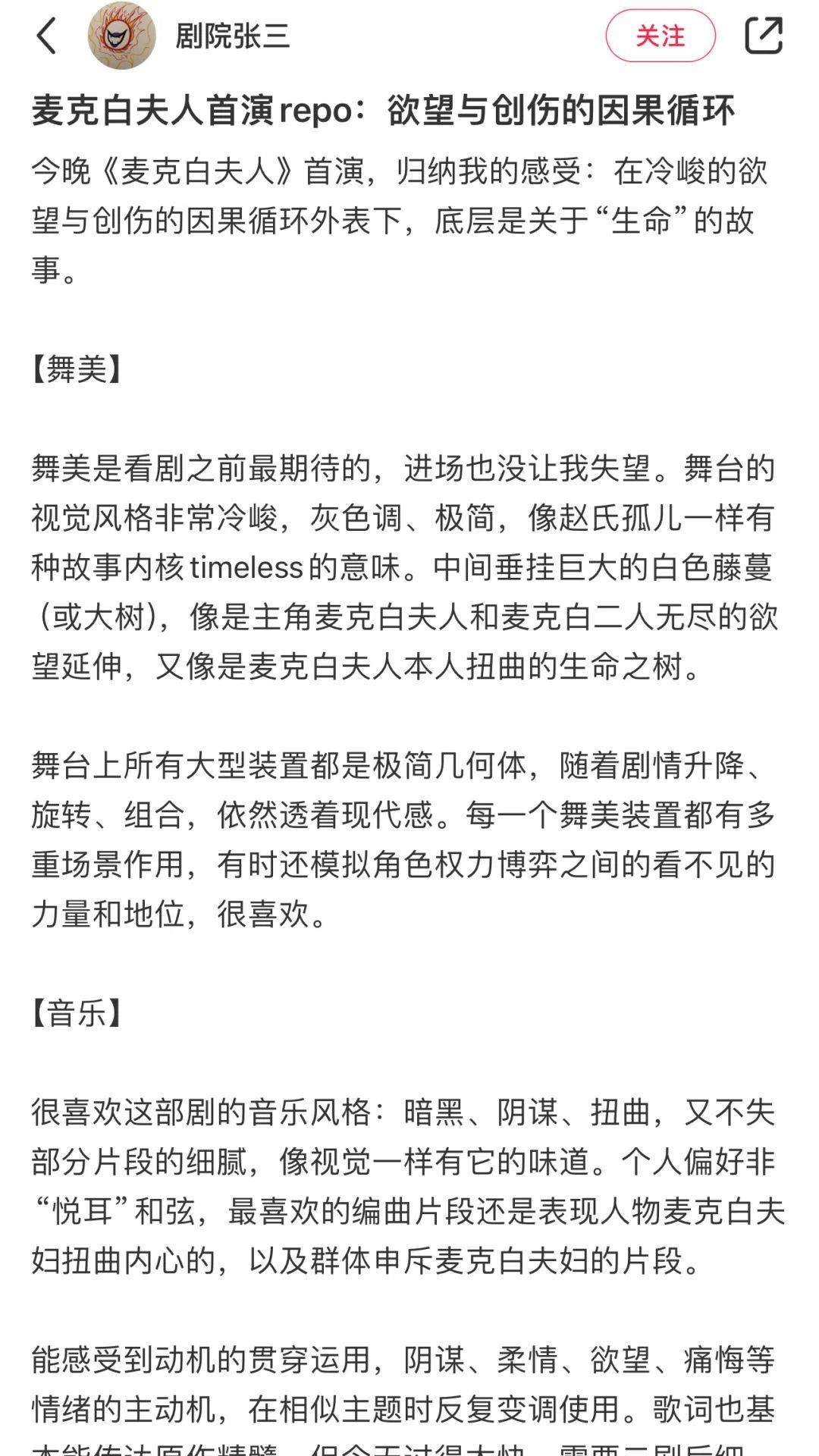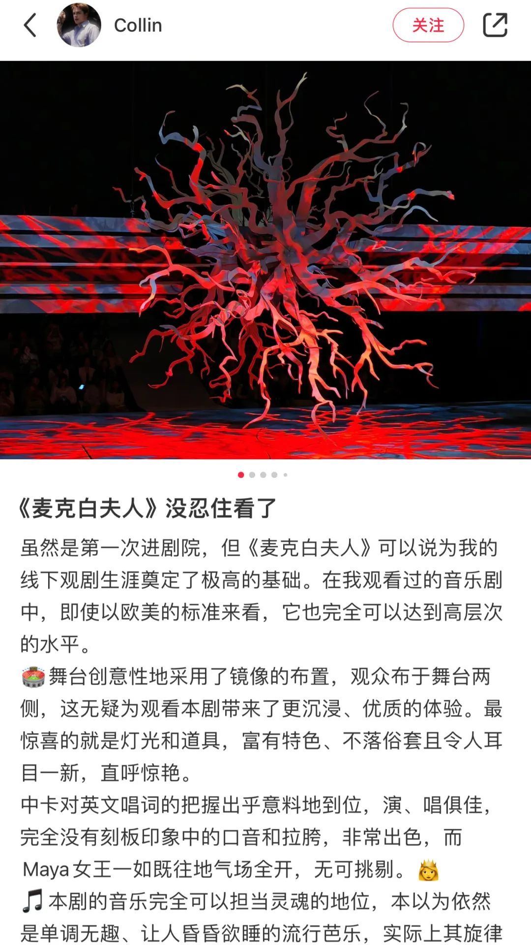 《麦克白夫人》首轮连演30场,迅速在媒体与观众群中引起破圈裂变传播,收获众多报道与深度剧评。不少观众自发分享多重解读视角,“封神”、“next level”、“唱功能打”、“神级舞美”、“大女主剧”等都成为这部剧的评价关键词。据不完全统计,全网曝光量已超7300万。